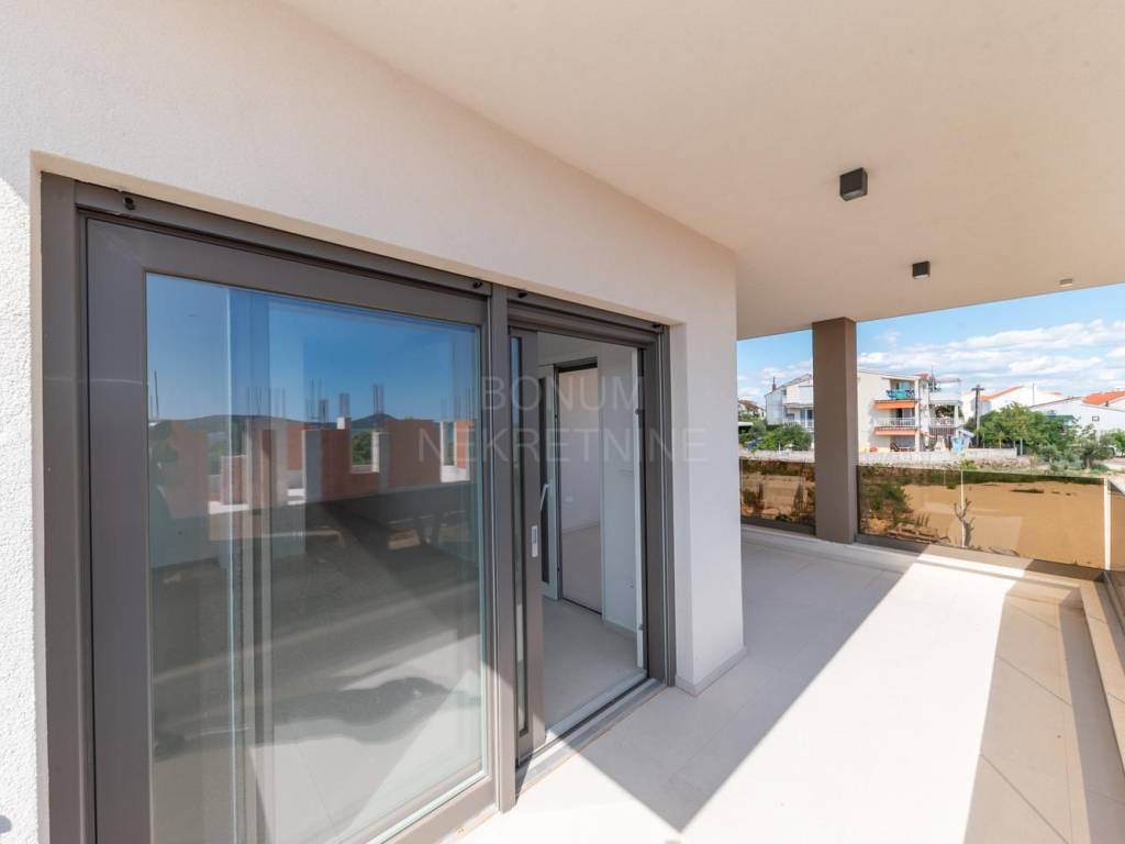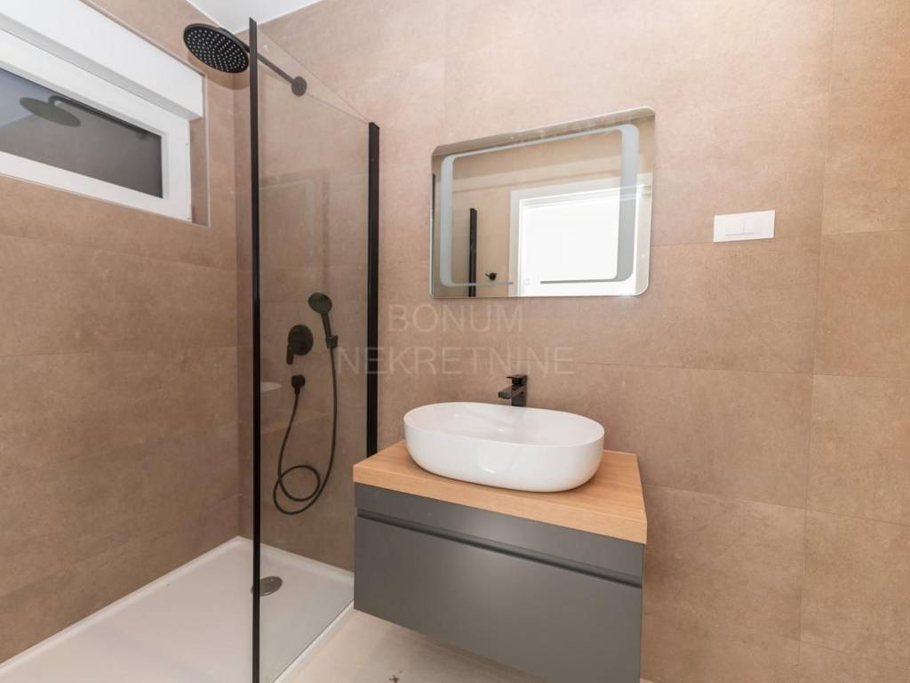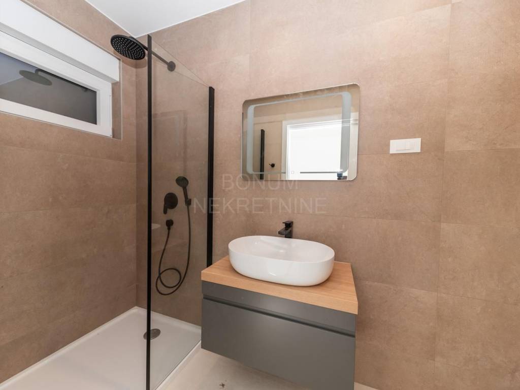 Stan je opremljen kvalitetnim i modernim materijalima i sadržajima koji osiguravaju visoku razinu udobnosti i sigurnosti. Ima stiropor fasadu koja jamči dobru izolaciju, PVC stolariju s komarnicima i rolete s električnim podizačima. Ulazna vrata su protuprovalna i protupožarna, a podne obloge čine elegantne talijanske keramičke pločice. Kupaonice su opremljene suvremenim sanitarnim elementima, a u svim prostorijama postavljeno je podno grijanje i klima uređaji. TV i internet priključci nalaze se u svakoj sobi, što omogućuje potpunu funkcionalnost i udobnost.