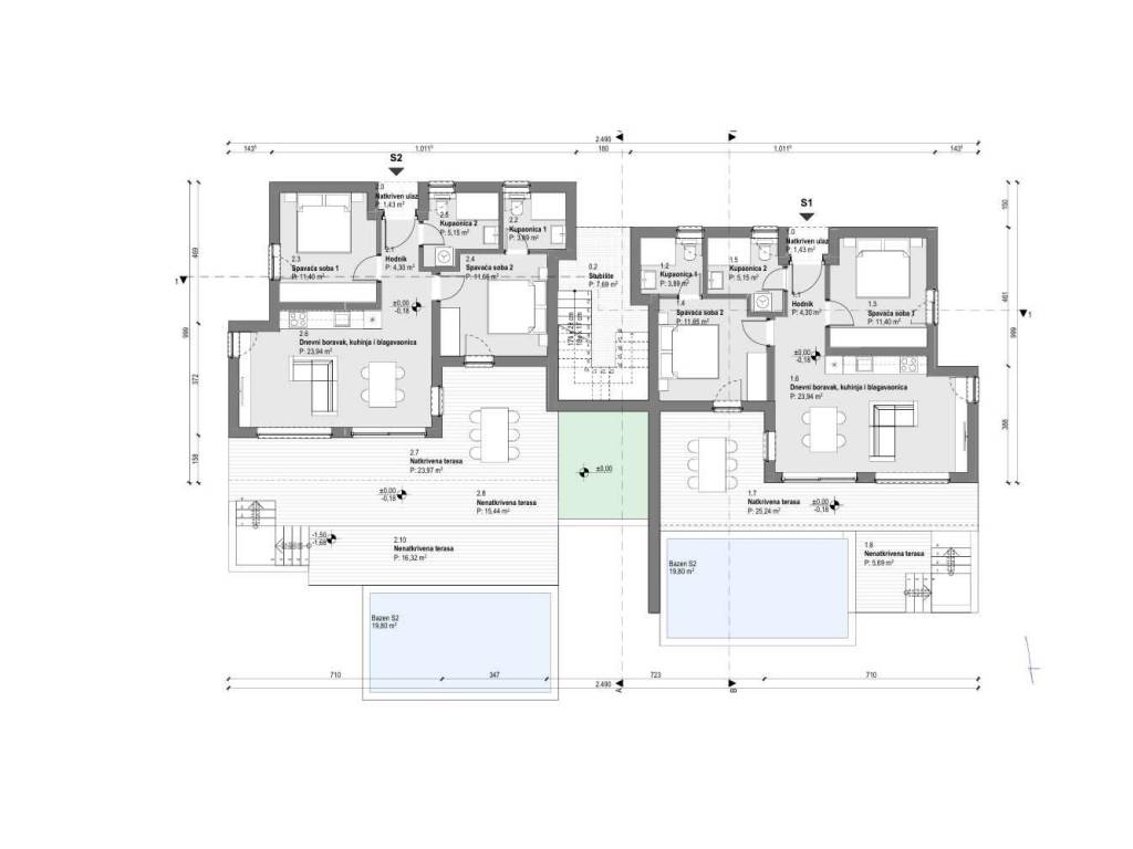 Stan S1 smješten je u prizemlju te nudi savršen spoj udobnosti i mediteranskog ugođaja. Sastoji se od hodnika, kuhinje povezane s blagovaonicom i dnevnim boravkom, iz kojeg se izlazi na djelomično natkrivenu terasu od 24,25 m² i dodatnu nenatkrivenu terasu površine 5,69 m². Poseban doživljaj pruža vlastiti bazen od 19,80 m², idealan za opuštanje u toplim ljetnim danima.