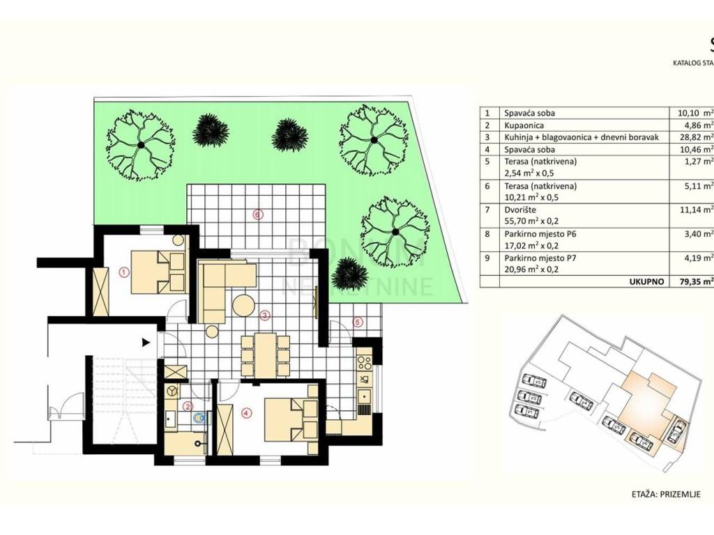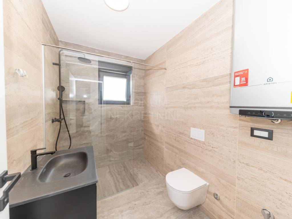 Na prodaju je dvosoban apartman oznake S1, smješten u prizemlju nove stambene zgrade. Apartman ima ukupnu korisnu površinu od 79,35 m², od čega je 54,24 m² stambene površine. Sastoji se od dvije spavaće sobe, kupaonice, blagovaonice povezane s dnevnim boravkom s izlazom na natkrivenu terasu te kuhinje koja ima pristup manjoj nenatkrivenoj terasi. Apartman je okružen vrtom površine 55,70 m², a pripadaju mu i dva parkirališna mjesta. Opremljen je klima uređajem, podnim grijanjem u kupaonici i dnevnom boravku, video portafonom, električnim podizačima roleta, komarnicima na prozorima te vrhunskim materijalima keramike i sanitarne opreme.