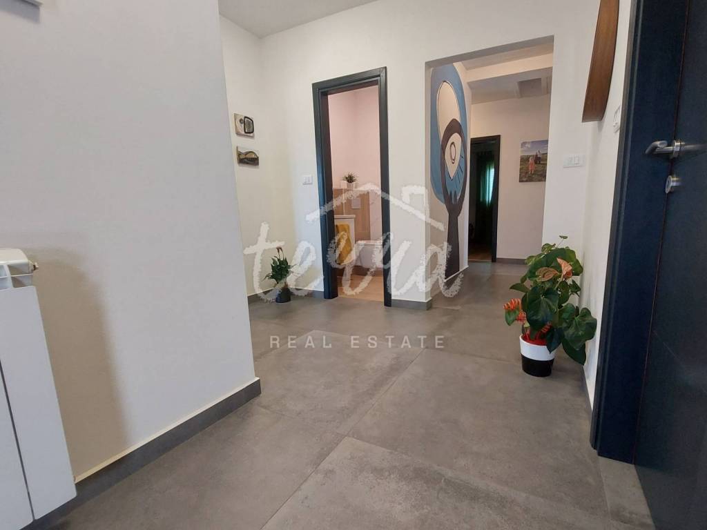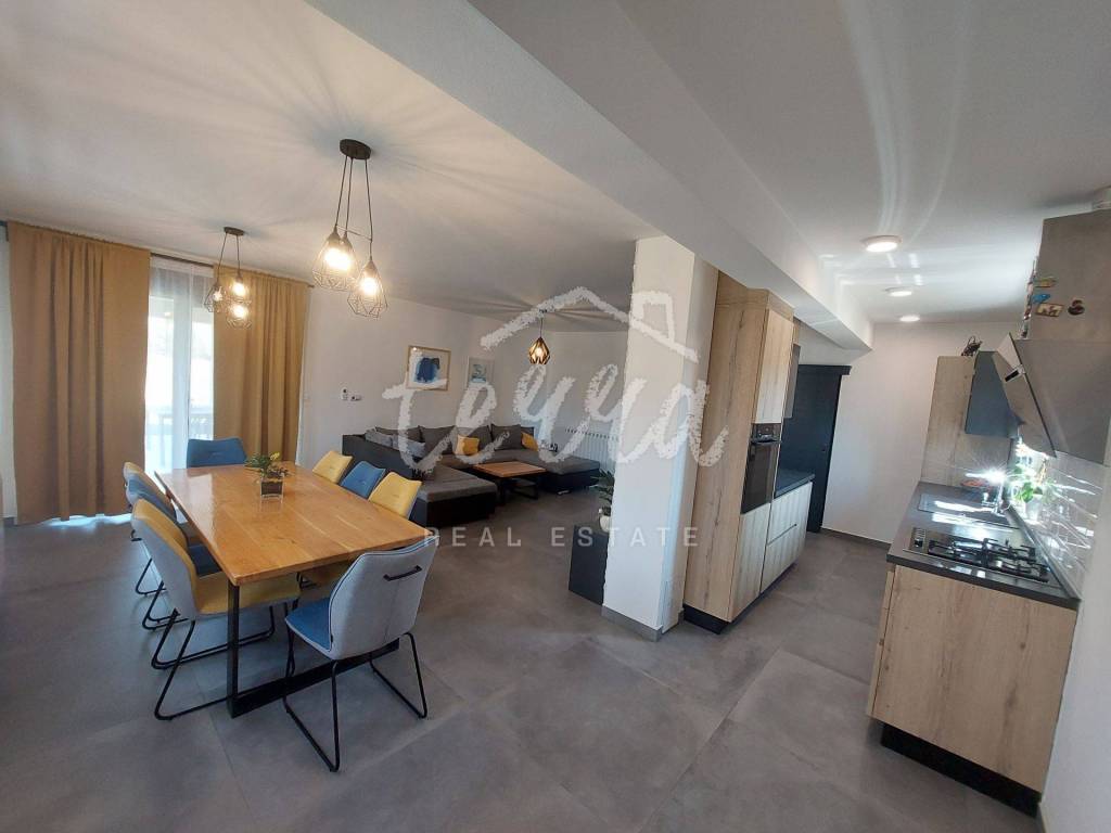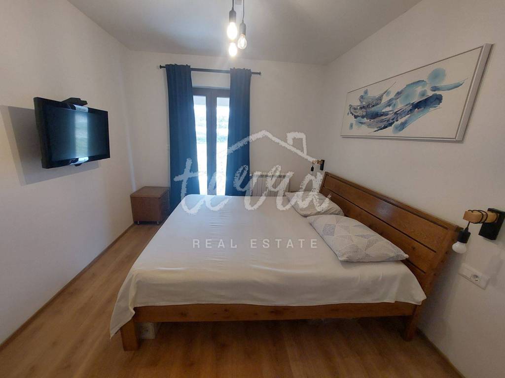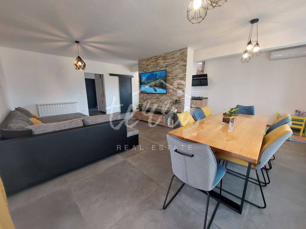 Kuća se sastoji od ulaznog hola,open space kuhinja,blagovaona i dnevnog boraka osvijetljeno velikim staklenim stijenama sa izlazom na veliku natkrivenu terasu,