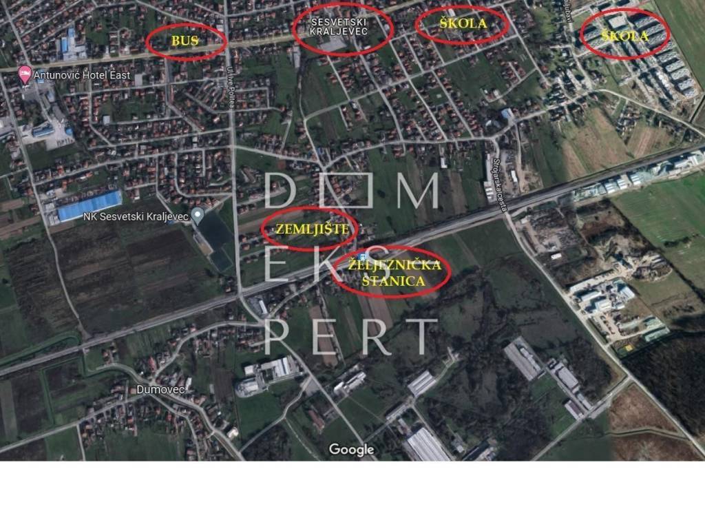 Lokacija: zemljište je udaljeno 1,5 kilometar od osnovne škole i većih trgovina. Autobusna stanica je udaljena 800, a željeznička stanica 500 metara.