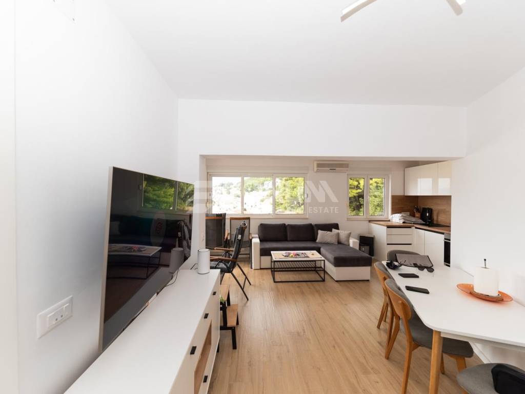 Stan se sastoji od dvije spavaće sobe, prostranog dnevnog boravka povezanog s kuhinjom i blagovaonicom, moderno uređene kupaonice te balkona s otvorenim pogledom na more i otoke. Interijer je pažljivo održavan i odmah useljiv, a raspored prostora pruža osjećaj prozračnosti i udobnosti.