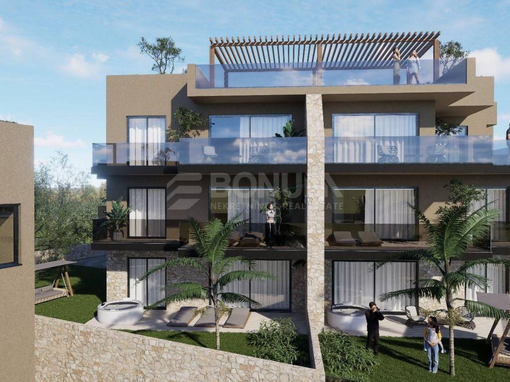 Kompleks od tri zgrade projektiran je s naglaskom na kvalitetan odmor i komfor svakog stanara. Na raspolaganju su zajednički bazen s pogledom na more, prostrano sunčalište, vanjska teretana te uređeno mjesto za roštiljanje i druženje. Cjelokupan okoliš održavan je i hortikulturno uređen, stvarajući ugođaj malog privatnog resorta.
