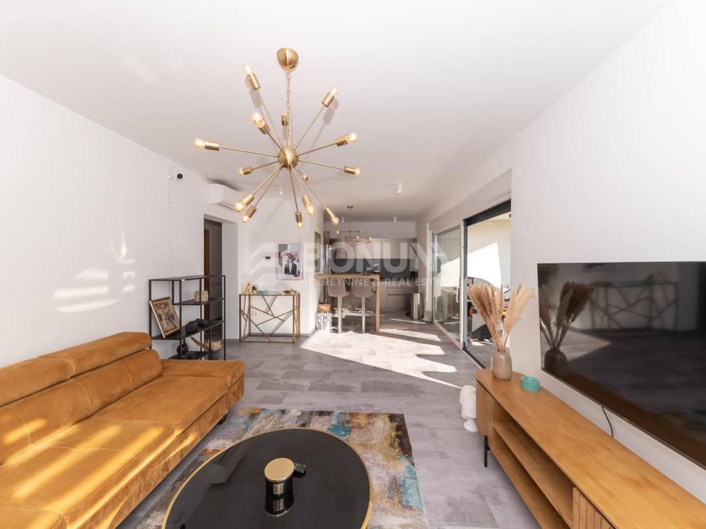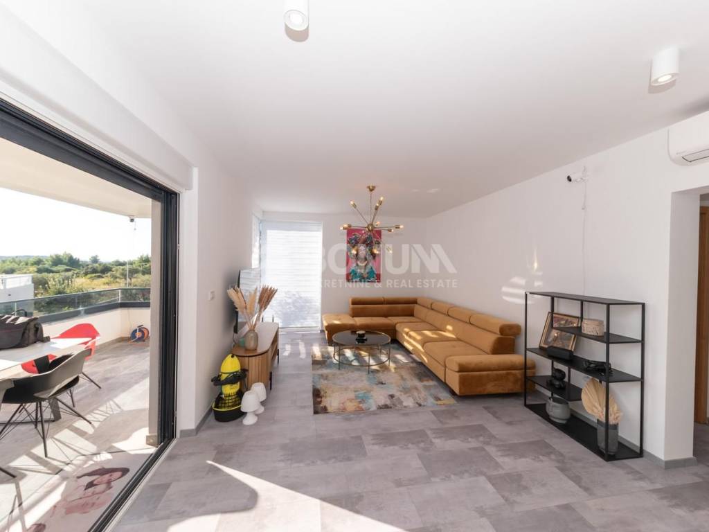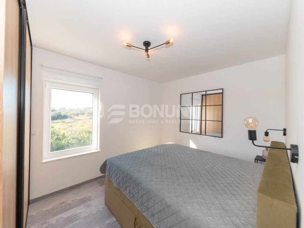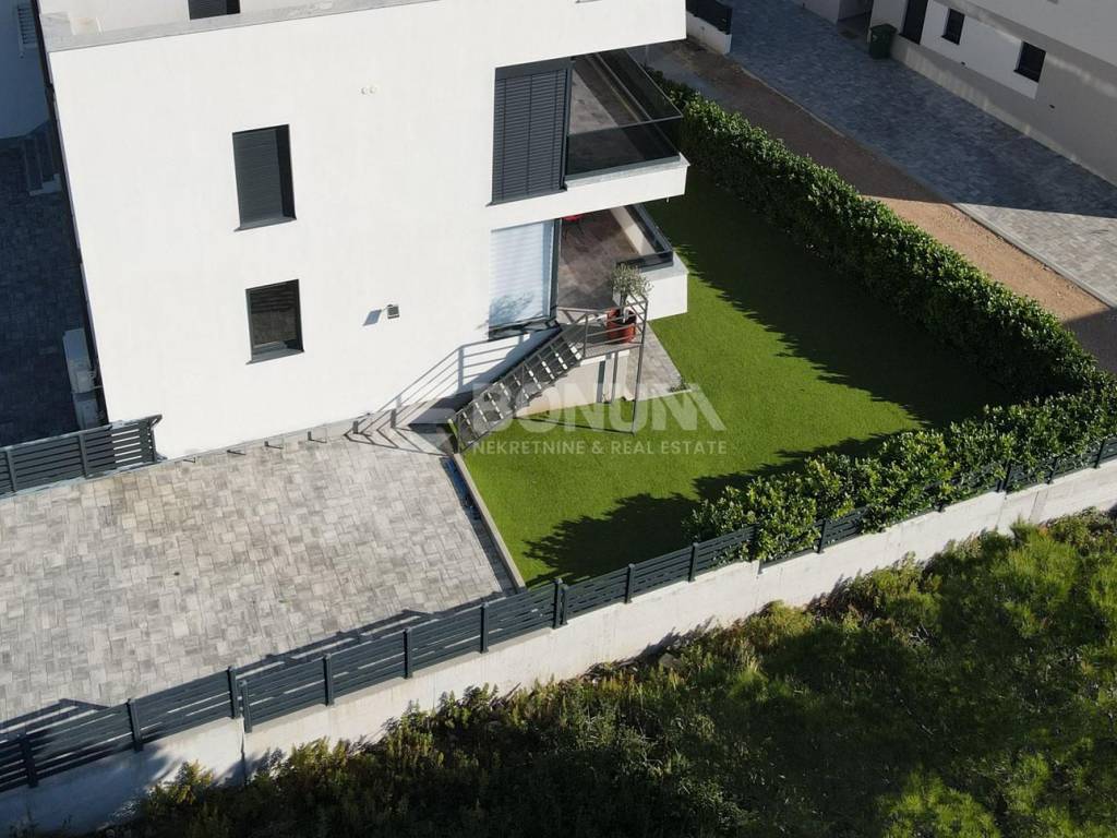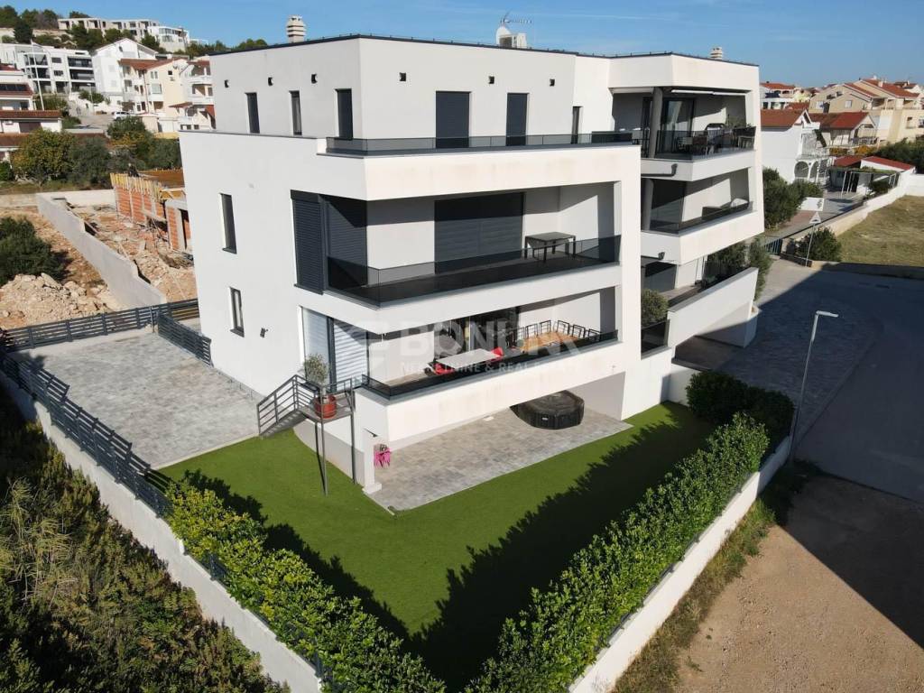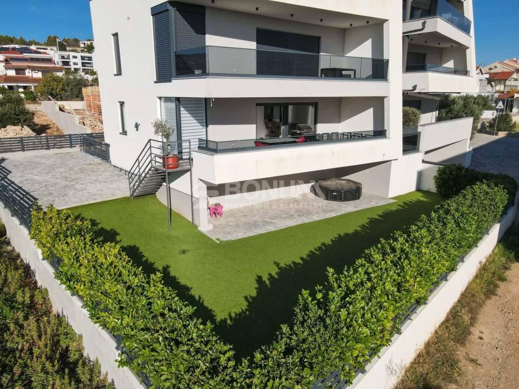 Na prodaju je moderan i luksuzan stan u Vodicama, smješten u prizemlju suvremene zgrade izgrađene 2021. godine. Stan se nalazi na mirnoj lokaciji, u blizini plaže, svega 300 metara od mora, i nudi udobnost, privatnost te visoku razinu kvalitete stanovanja.