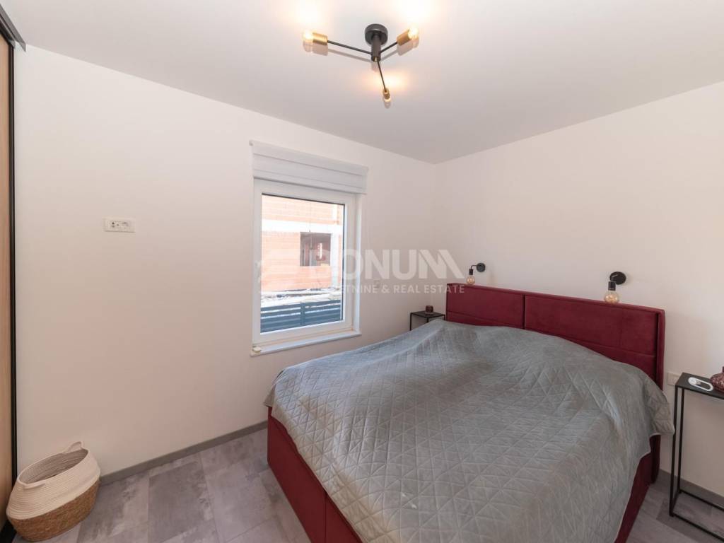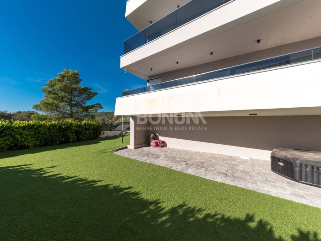 Stan je opremljen prema suvremenim standardima. Vrt je ograđen što osigurava privatnost, djelomično je popločan, dok je ostatak prekriven umjetnom travom i uređen kao ugodan vanjski prostor za boravak.