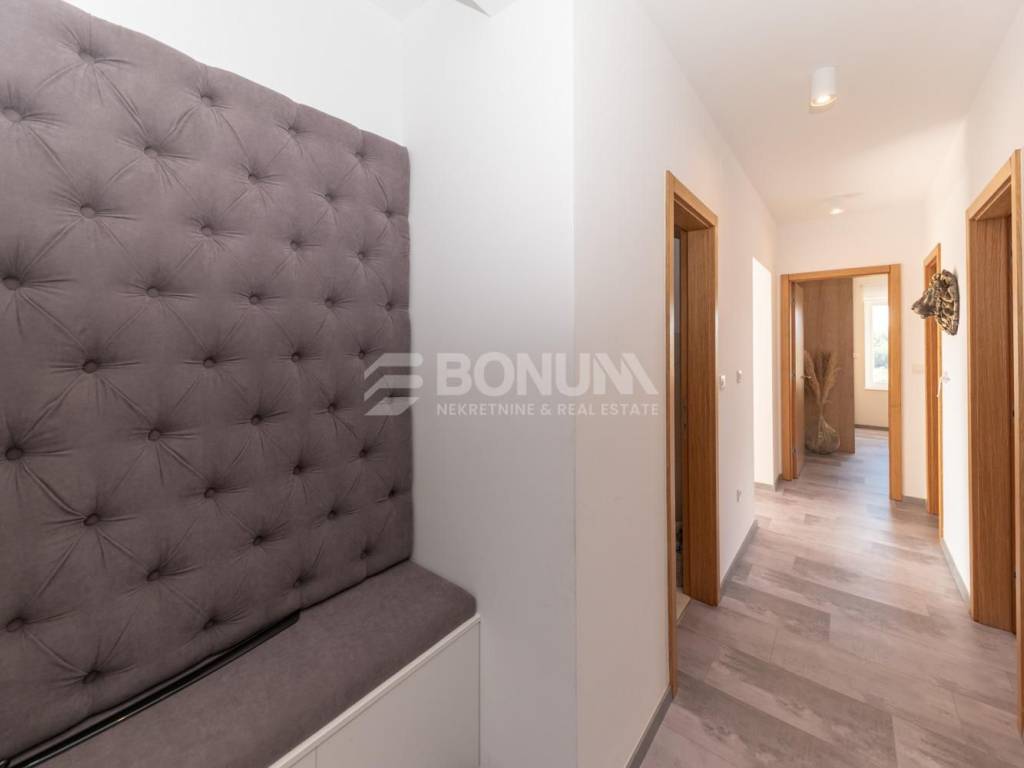 Ukupna neto stambena površina iznosi 119,47 m². Unutarnji prostor obuhvaća hodnik, dvije spavaće sobe, prostranu kuhinju povezanu s blagovaonicom i dnevnim boravkom, kupaonicu, zaseban WC te natkrivenu terasu ukupne površine 94,59 m². Uz stan dolazi spremište od 5,88 m² smješteno u suterenu zgrade, dva parkirna mjesta površine 13,30 m² i 13,10 m², kao i lijepo uređen vrt od 144 m².