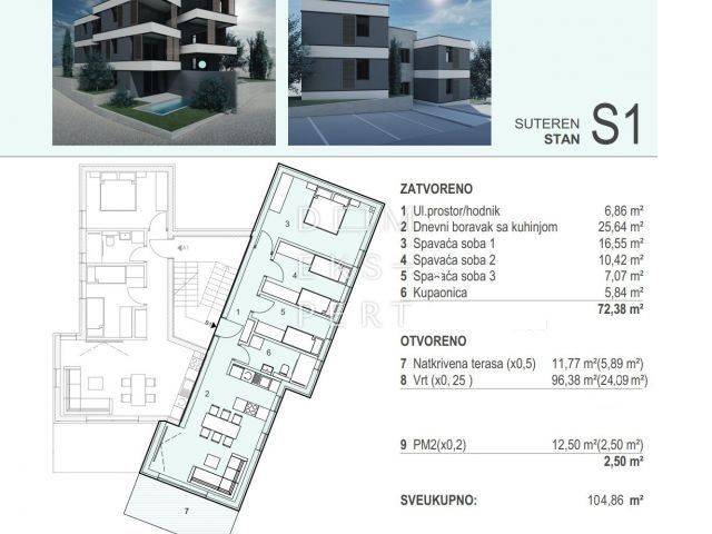 Svi pripatci se obračunavanju po odgovarajućim koeficijentima, pa neto korisna površina apartmana sa svim pripatcima iznosi 104,86 m2.