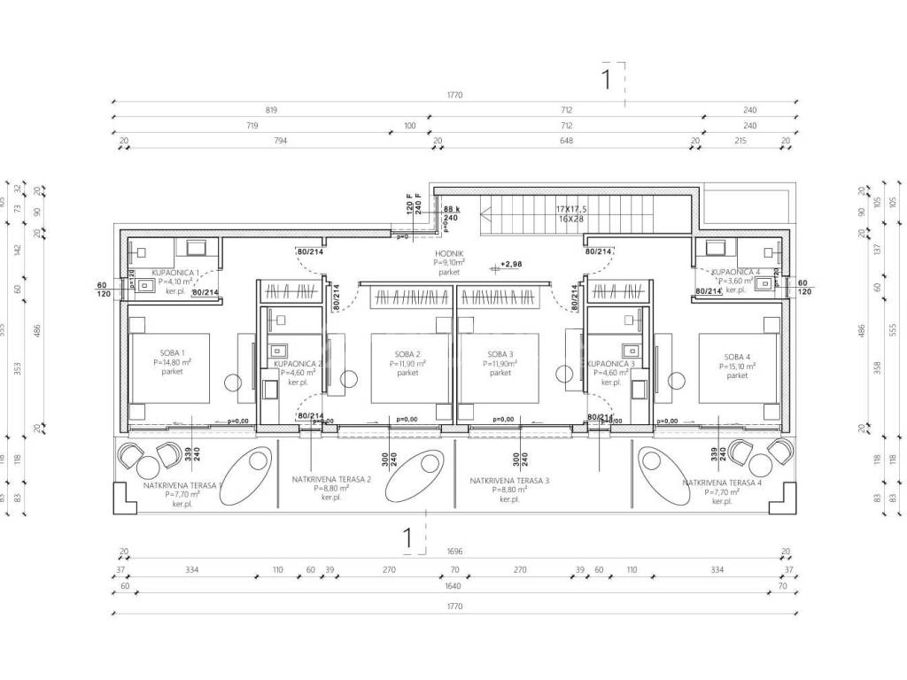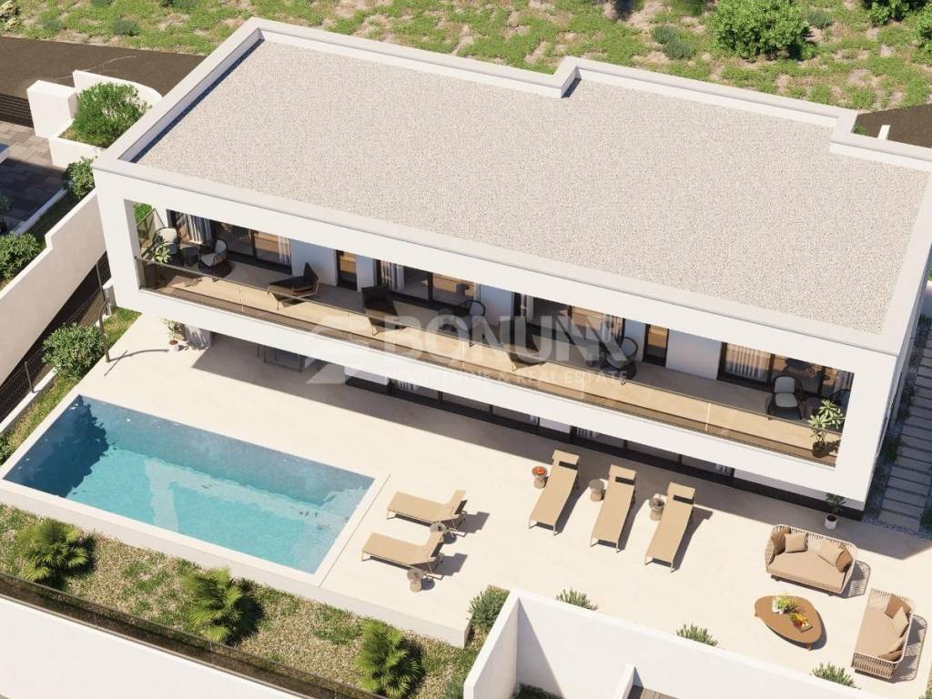 Na katu se nalazi noćna zona s četiri spavaće sobe i četiri kupaonice. Svaka soba ima pristup vlastitoj natkrivenoj terasi, što osigurava dodatni komfor i privatnost, a raspored je idealan za obiteljski boravak ili smještaj gostiju.