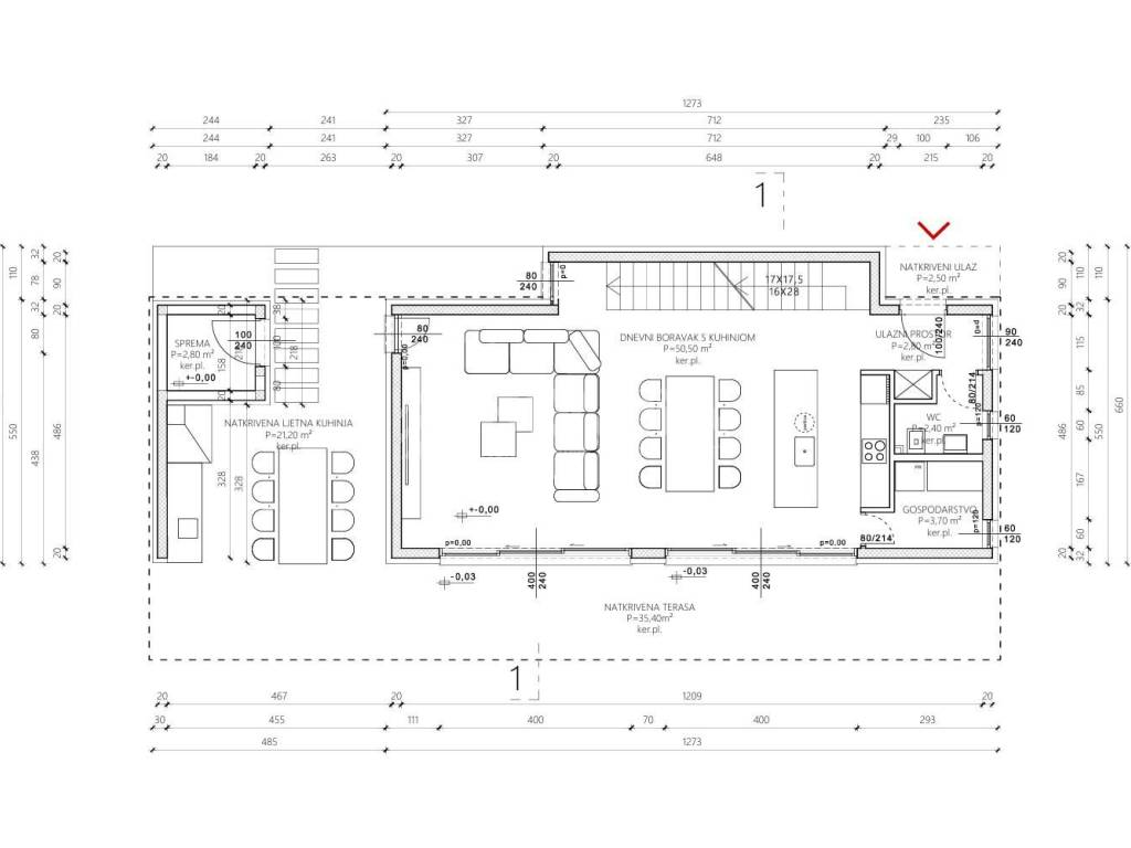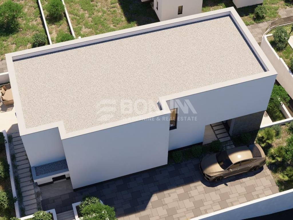 Vila je projektirana na tri etaže – podrum, prizemlje i kat – s jasno odvojenim dnevnim, noćnim i zabavnim dijelom. Prizemlje je osmišljeno kao prostrani open space dnevni boravak s kuhinjom i blagovanjem, koji se prirodno nastavlja na veliku natkrivenu terasu, savršenu za boravak na otvorenom. Uz dnevni dio nalaze se ulazni prostor, gostinjski WC, gospodarstvo/utility i spremište, a dodatnu vrijednost daje natkrivena ljetna kuhinja, zamišljena kao centralno mjesto druženja.