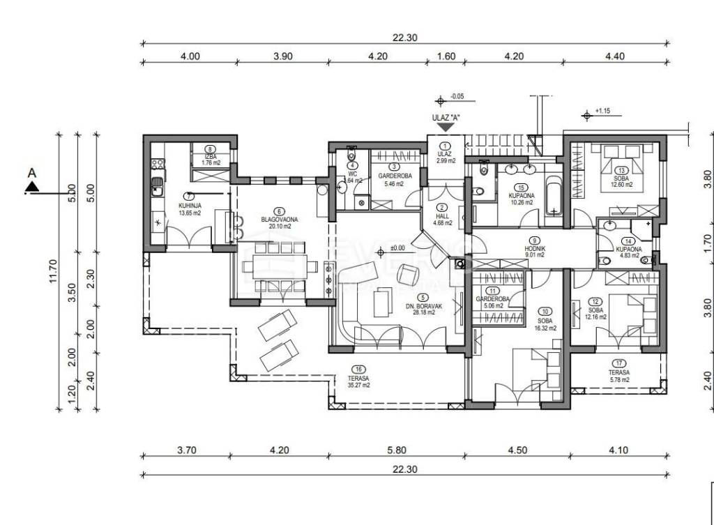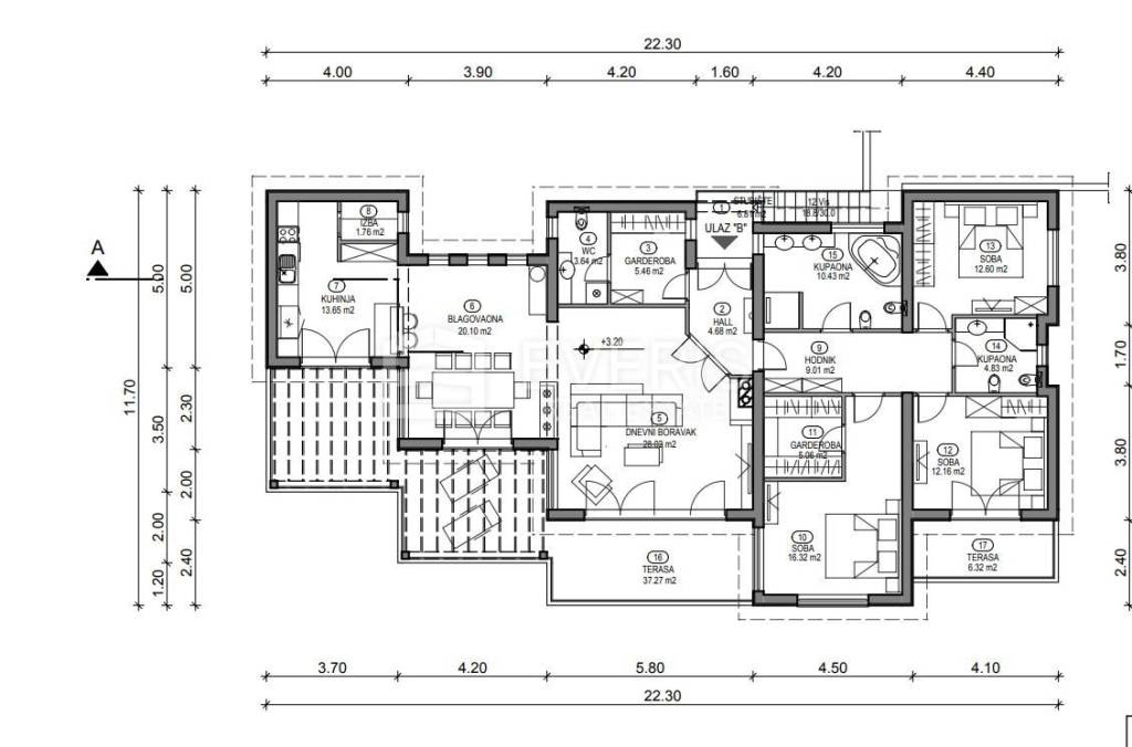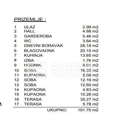 ▪ Prizemlje: stan ukupne površine 191,75 m2, a koji se sastoji od: ulaz (2,99 m2), hodnik (4,68 m2), garderoba (5,46 m2), toalet (3,64 m2), dnevni boravak (28,18 m2), blagovaona (20,10 m2), kuhinja (13,65 m2), izba (1,76 m2), hodnik (9,01 m2), tri spavaće sobe (41,08 m2), tri kupaone (20,15 m2), i terase (41,05 m2).