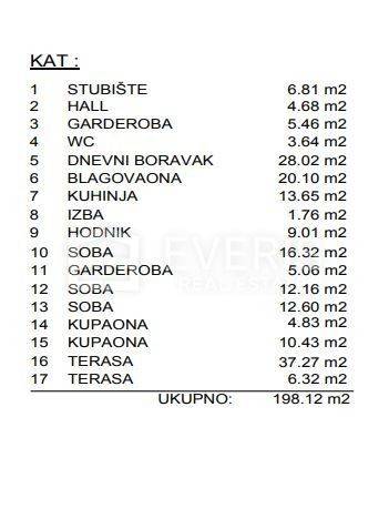 ▪ Kat: stan ukupne površine 198,12 m2, a koji se sastoji od: stubište (6,81 m2), hodnik (4,68 m2), dvije garderobe (10,52 m2), toalet (3,64 m2), dnevni boravak (28,02 m2), blagovaona (20,10 m2), kuhinja (13,65 m2), izba (1,76 m2), hodnik (9,01 m2), tri spavaće sobe (41,08 m2), dvije kupaone (15,26 m2), i terase (43,59 m2).
