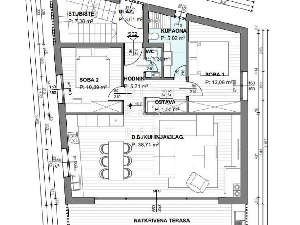 STAN SE SASTOJI OD: - hodnika (7.54 m²) - dnevnog boravka s kuhinjom i blagovaonicom (38.37 m²) - dvije spavaće sobe (10.33 m² i 12.35 m²) - ostave (1.51 m²) - kupaonice (5.22 m²) - natkrivene terase (22.70 m²)