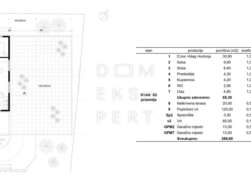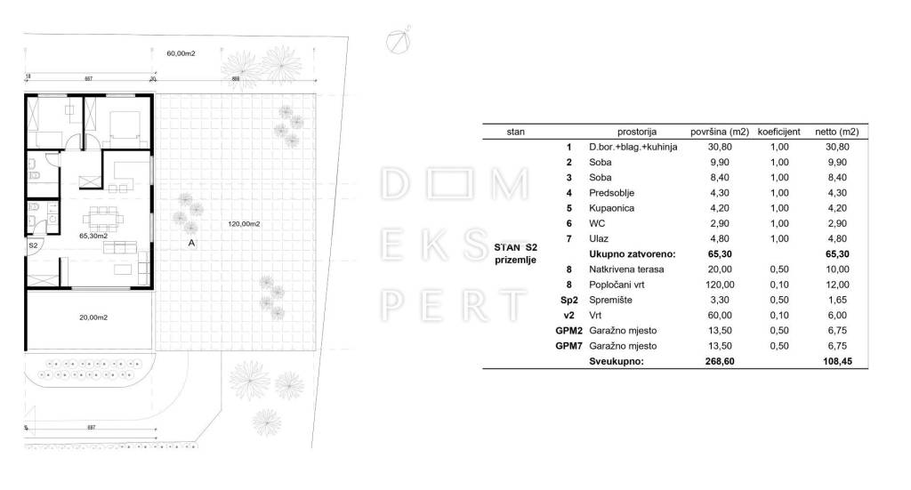 Prodaje se moderan trosoban stan s vrtom u prizemlju zgrade u izgradnji na Srebrnjaku. Grijana stambena površina stana iznosi 65.30 m², pripadci se obračunavaju po koeficijentima, a neto korisna površina stana sa svim pripadcima iznosi 108.45 m².