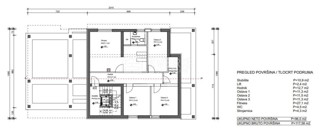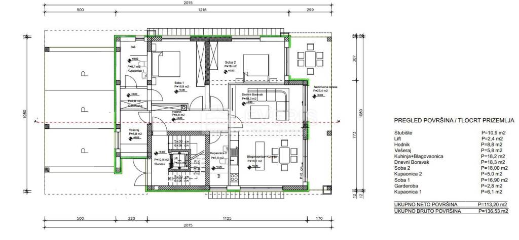 ▪ hodnik: 8,80 m2, kuhinja / blagovaona i dnevni boravak: 36,50 m2, vešeraj: 5,80 m2, spavaća soba 1: 16,90 m2, spavaća soba 2: 18 m2, kupaonica 1: 6,10 m2, kupaonica 2: 5 m2, garderoba: 2,80 m2; stanu pripada: terasa 2,40 m2, okućnica 200 m2, bazen, spremište u podrumu: 11,30 m2 te dva parkirna mjesta.