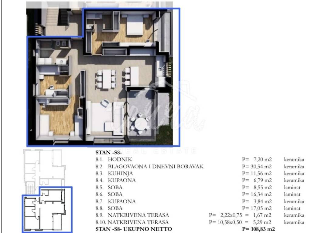 Ukupne površine od 108,83 četvornih metara, sastoji se od hodnika, tri spavaće sobe, kuhinje, blagovaone, dnevnog boravka, dvije kupaone i dvije natkrivene terase.