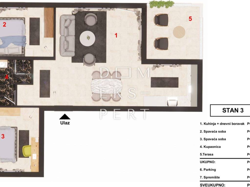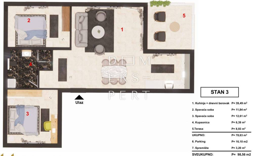 - ukupna površina stana s pripadcima 98.56 m² (terasa, parkirno mjesto, spremište)