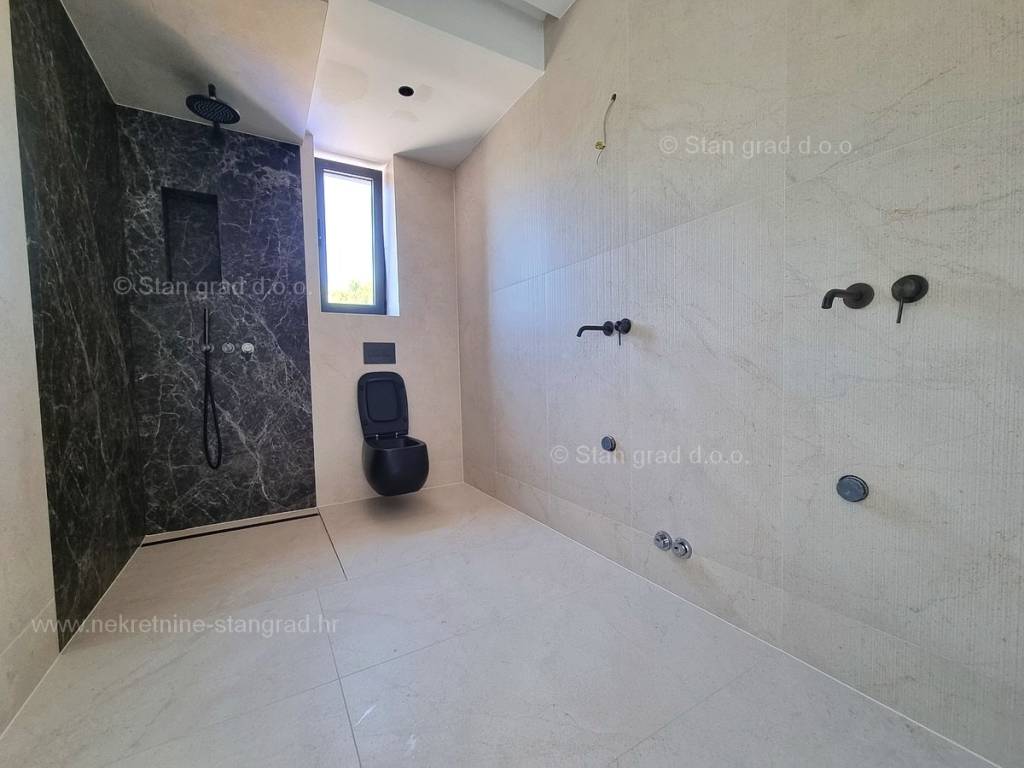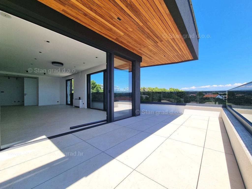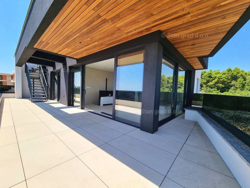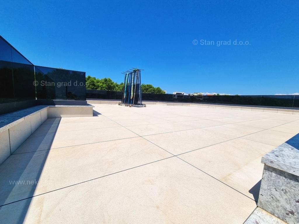 Gledajući vrstu nekretnine, ovo je veliki cjeloetažni apartman pozicioniran na 2. etaži. Apartman obuhvaća ukupnu površinu od približno 160 m2. Stan se sastoji od ulaznog hodnika, prostranog dnevnog boravka sa kuhinjom, blagovaonom, dvije spavaće sobe sa vlastitom kupaonicom, spavaće sobe, kupaonice, hodnika i ostave te balkona od 40 m2. S balkona se stepenicama penje na krovnu terasu od 85 m2 sa bazenom i sunčalištem. Bazen je površine 21 m2. Apartmanu pripada i spremište od 4m2 u podrumu. Vlasnik apartmana na raspolaganju će imati 2 parkirna mjesta.