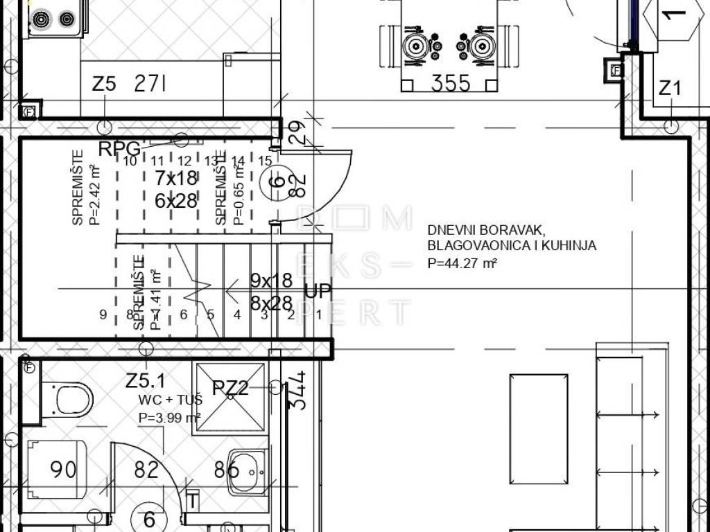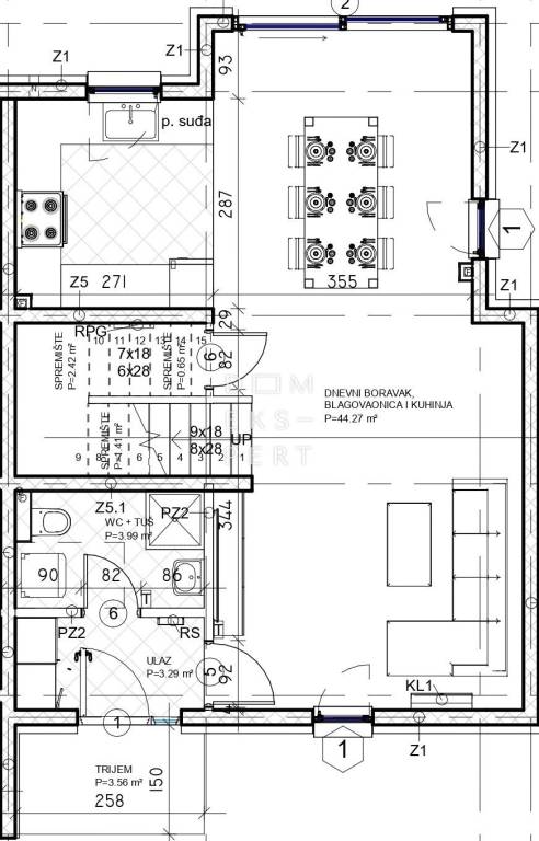 - dnevni boravak s blagovaonicom i kuhinjom (44.27 m²)