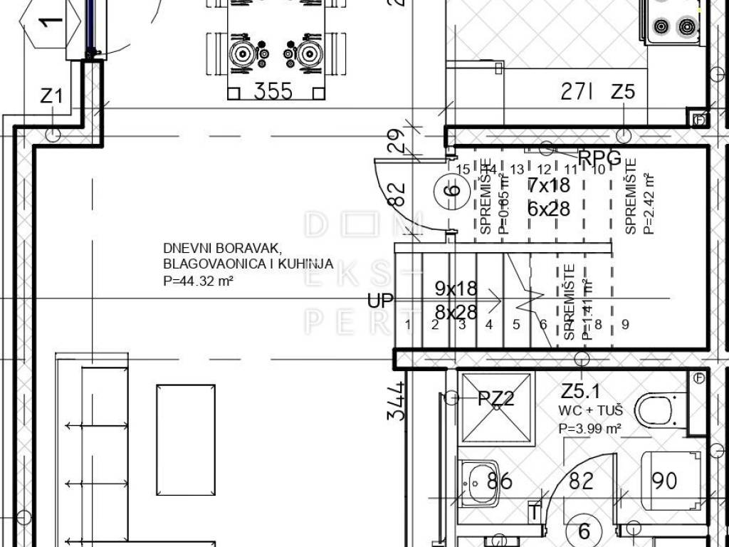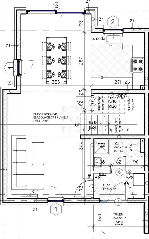 - dnevni boravak s blagovaonicom i kuhinjom (44.32 m²)