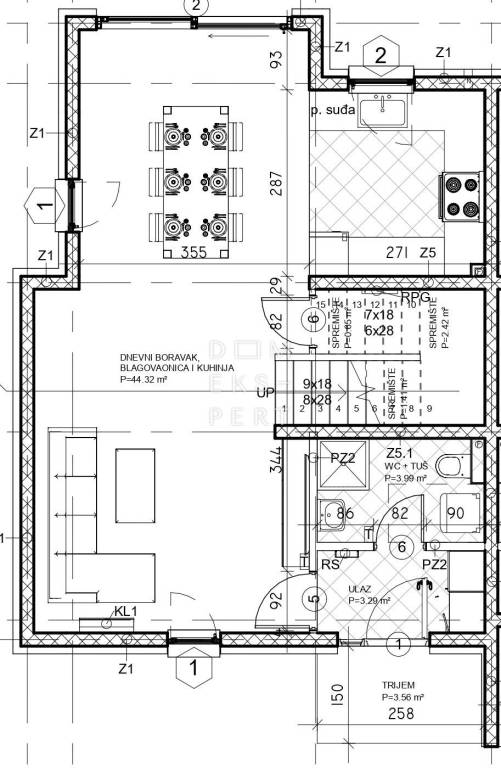 - dnevni boravak s blagovaonicom i kuhinjom (44.32 m²)
