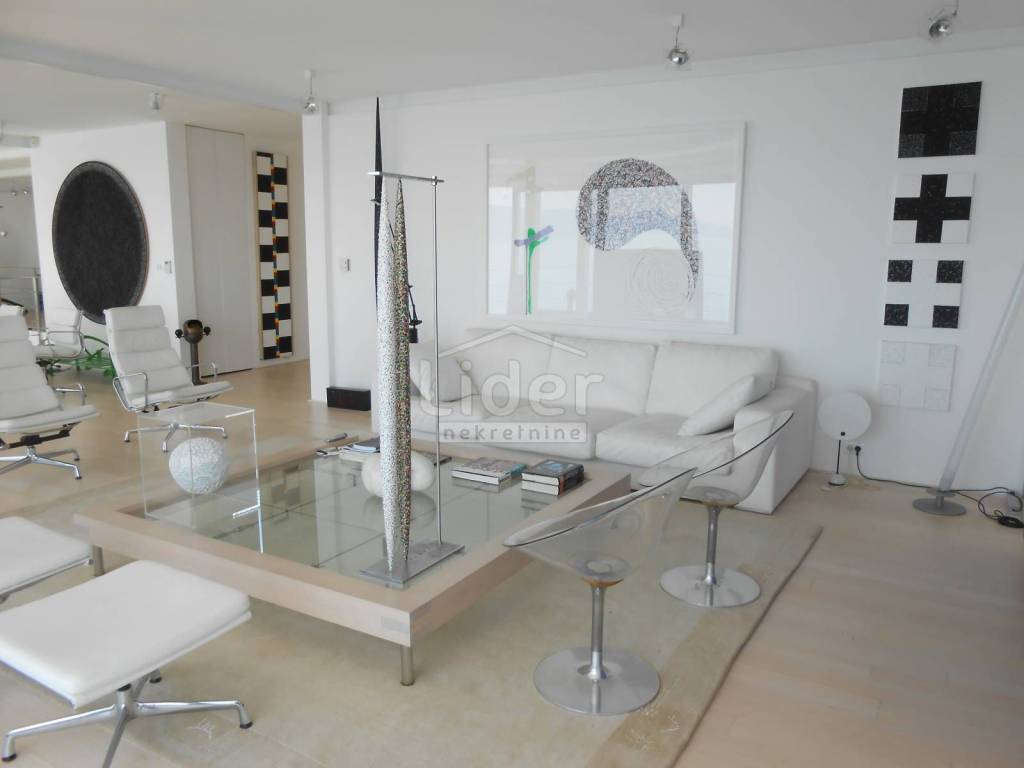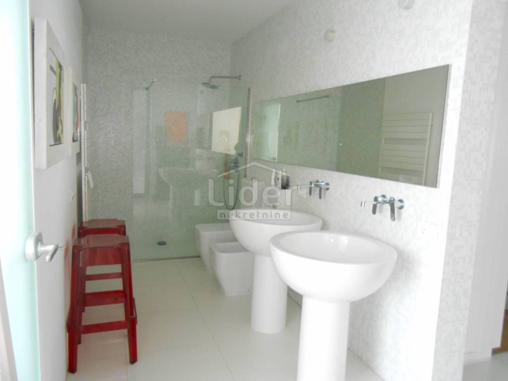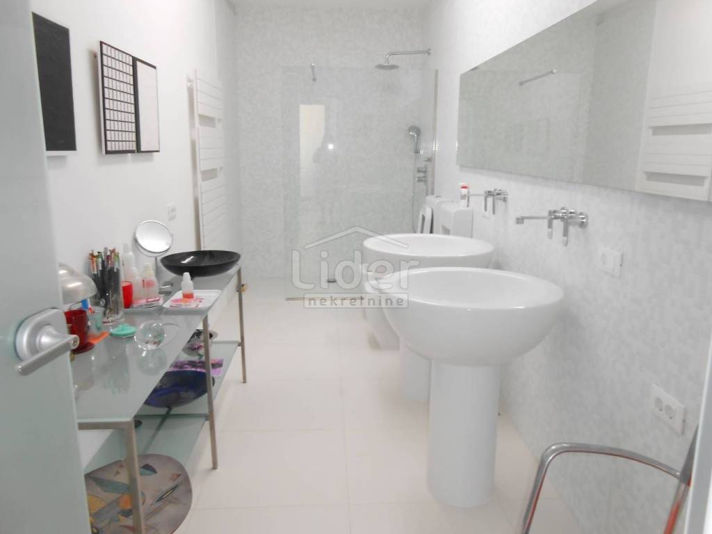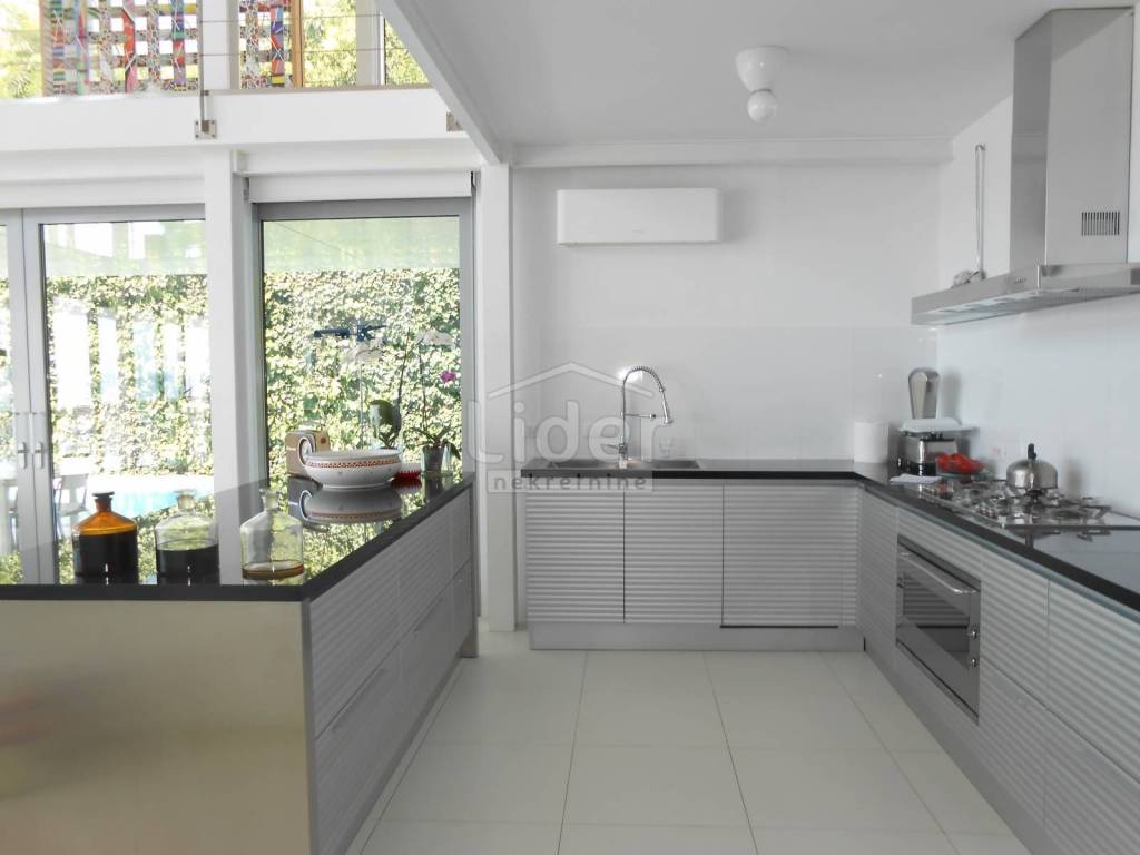 Ova predivna samostojeća villa nalazi se na Kantridi, stambene površine 550 m2, raspoređenih na suteren, prizemlje i kat. Sasvim posebna, unikatna kuća, novogradnja, građena je prema visokim standardima gradnje, od aluminijske stolarije, najkvalitetnije keramike, etažnog centralnog grijanja, podni fan coil, jedanaest nutarnjih jedinica klime i četiri vanjske, do sanitarija i svega ostalog zavidnog nivoa. Modernističkog izgleda jako se lijepo uklopila u okoliš. Na okućnici, cijela parcela ima 650 m2, su palme, zimzeleno i mediteransko bilje, a dodatni šarm daje intimni bazen i sunčalište na terasi od 150 m. Svaka etaža ima više kupaonica sa WC-ima, svoje zasebno grijanje, a kuća ima i lift. Lokacija je izvanredna, gradska lokacija, blizina svih sadržaja, a opet dovoljno izdvojena od buke i prometa.