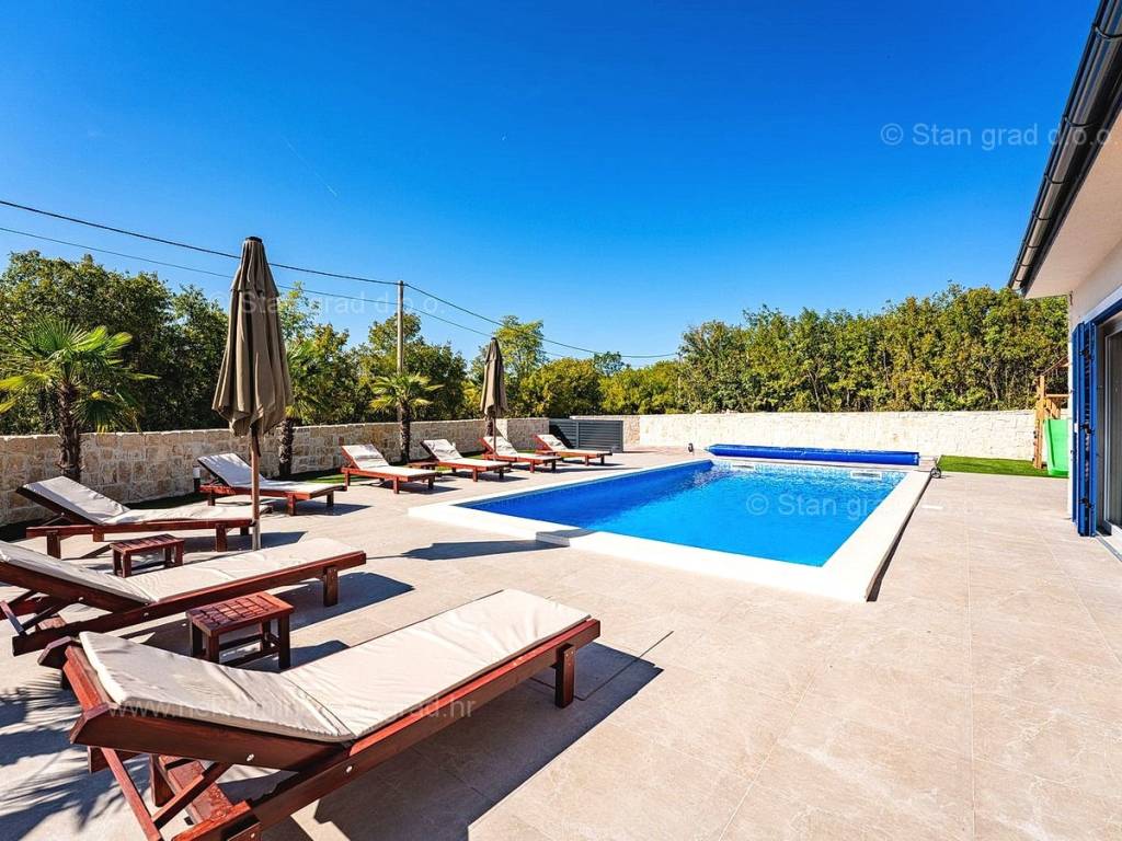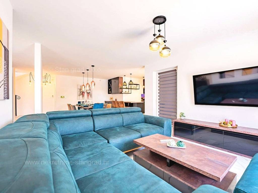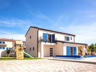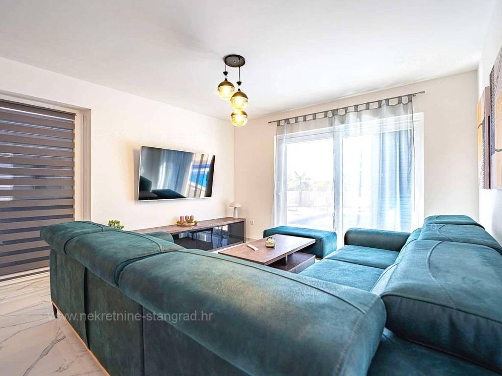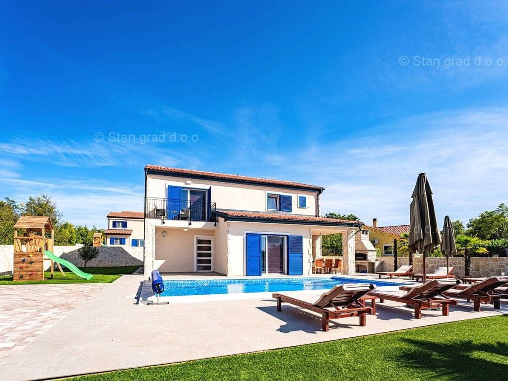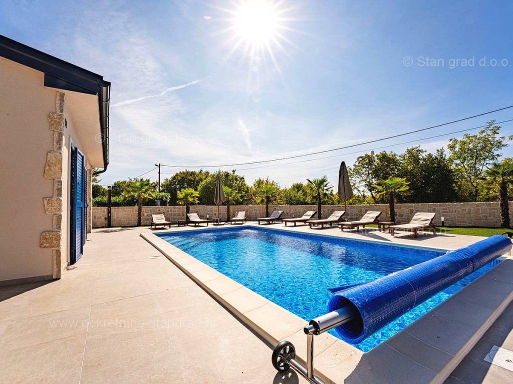 Vrlo lijepa vila je izvedena na 2 etaže. Kuća se proteže na ukupnoj površini 185 m2. U prizemlju se nalazi ulazni hodnik, blagovaona, kuhinja, dnevni boravak, wc, spavaća soba sa vlastitom kupaonicom te garderoba. Unutarnje stepenište vodi na 1. kat gdje se nalaze 3 sp. sobe, svaka sa vlastitom kupaonicom. Jedna soba ima izlaz na terasu sa koje se pruža prekrasan pogled na uređenu okolicu i prirodni krajolik. Iz dnevnog se boravka pruža izlaz na terasu, sunčalište i bazen. Visoka kvaliteta gradnje i opreme, klimatizacija u svakoj sobi, podno grijanje na dizalicu topline, troslojna stolarija sa komarnicima i prostrana okućnica za komotno parkiranje vozila.