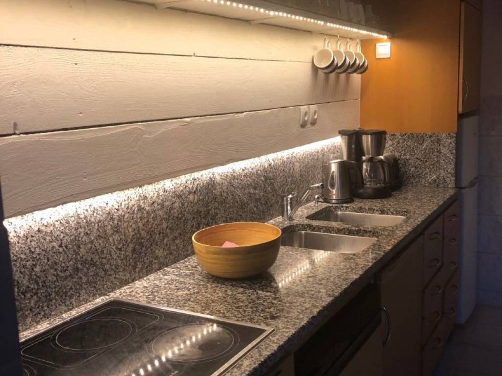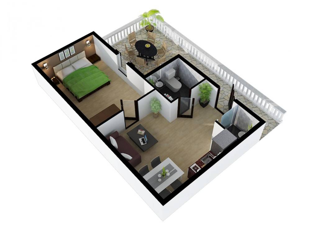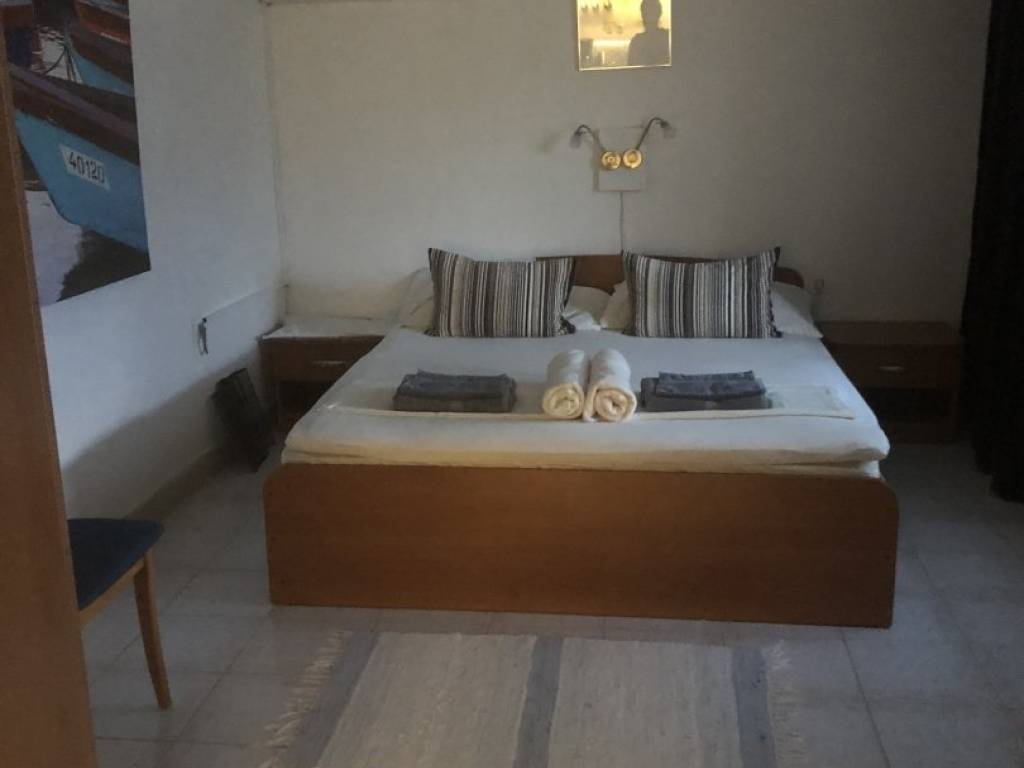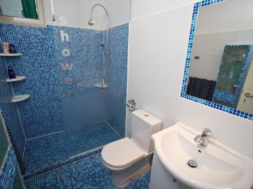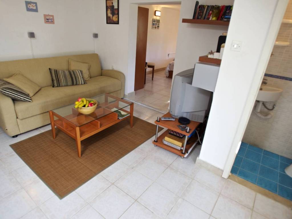 U prizemlju se nalazi stan ukupne neto površine 42,60 m2 sa dnevnim boravkom i kuhinjom, spavaćom sobom, kupaonicom i WC-om. Sa ulaznog platoa i natkrivene terase pruža se pogled na more