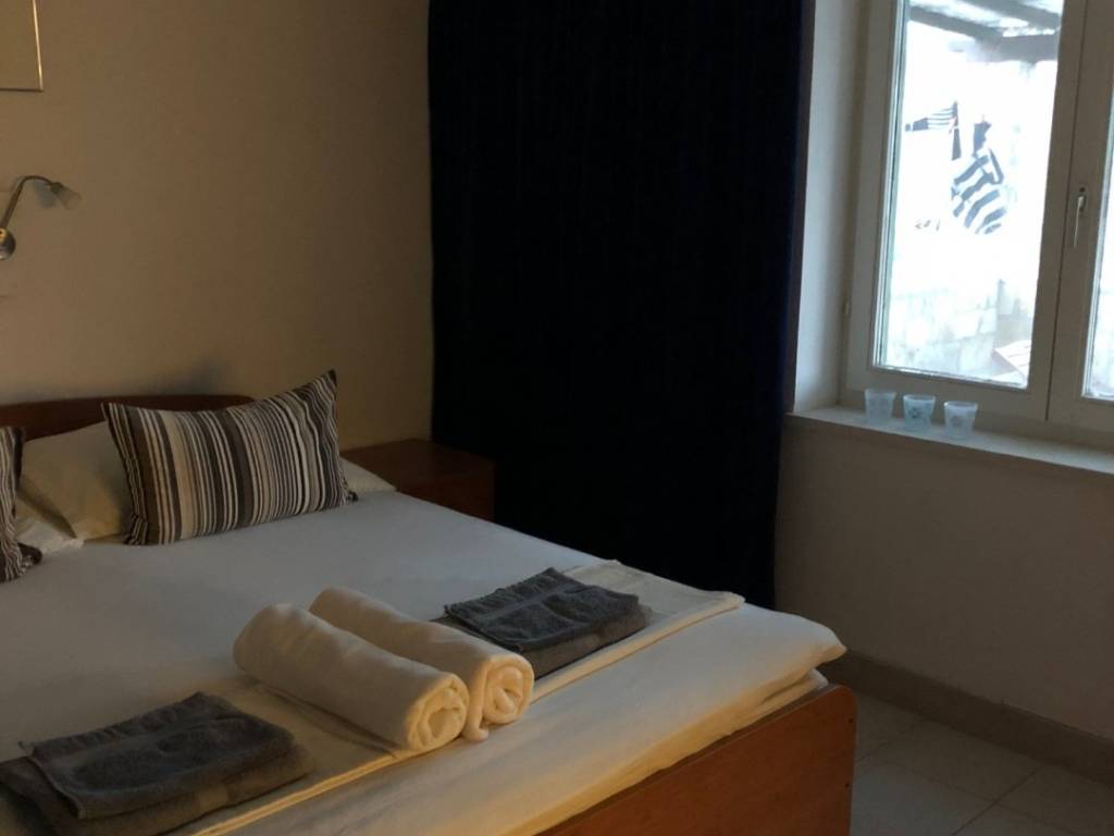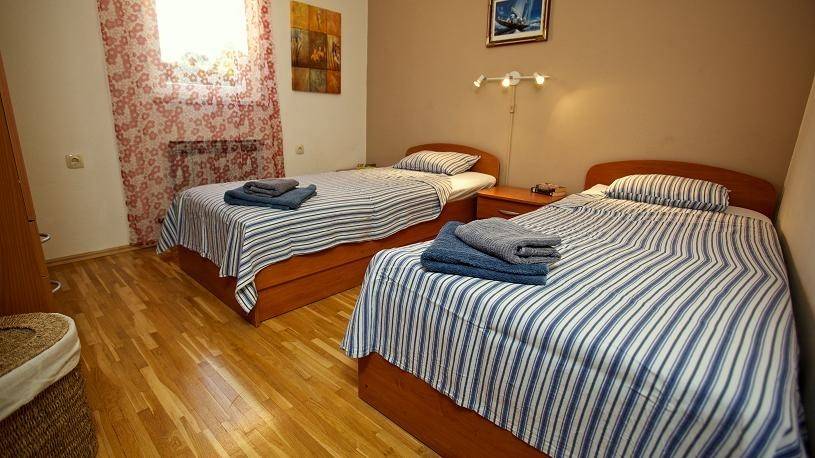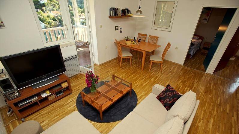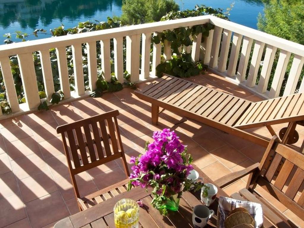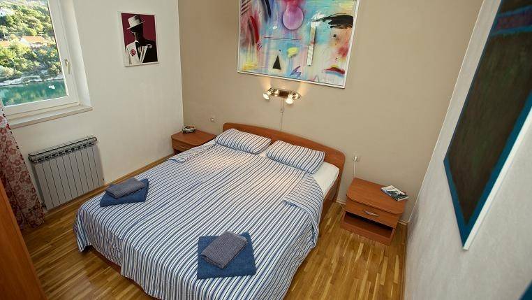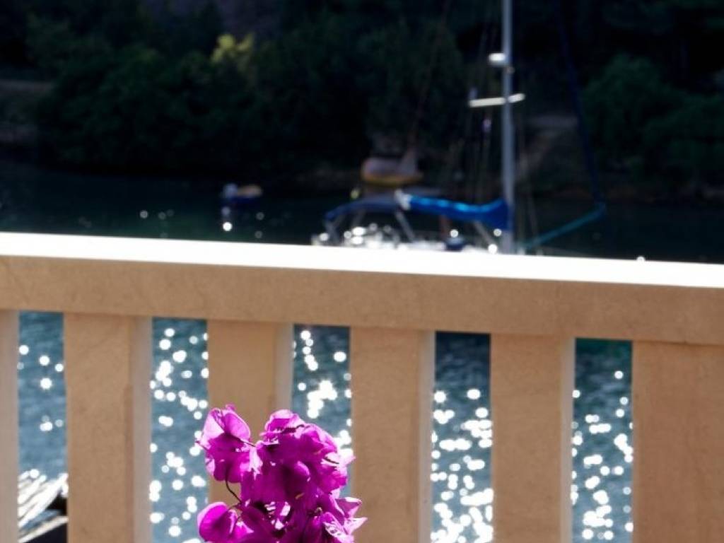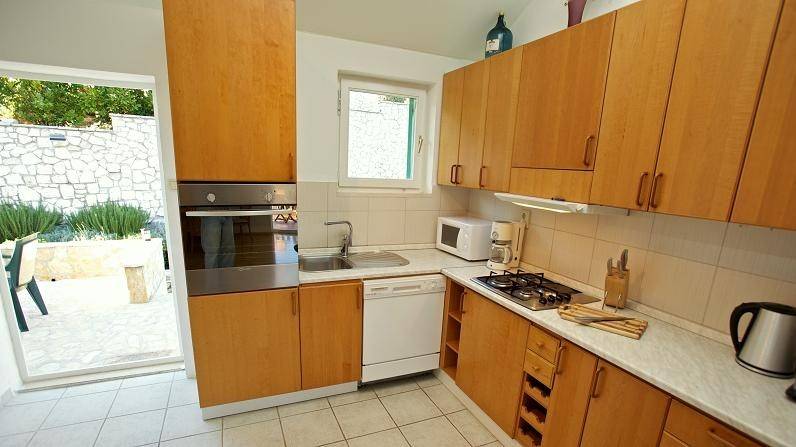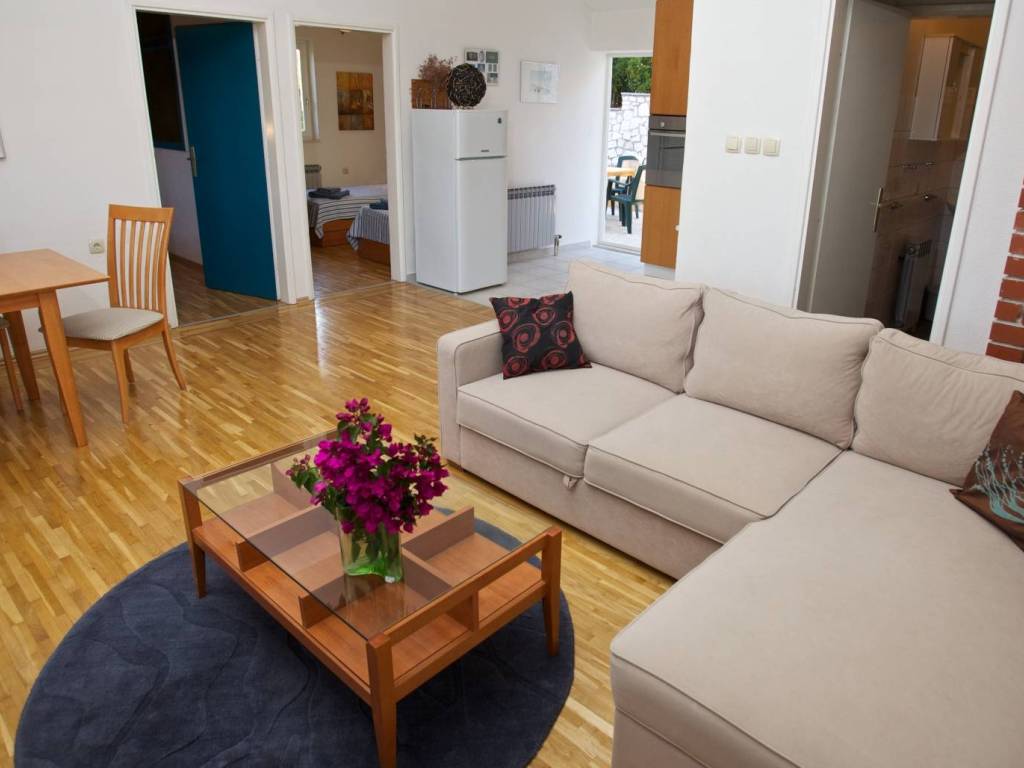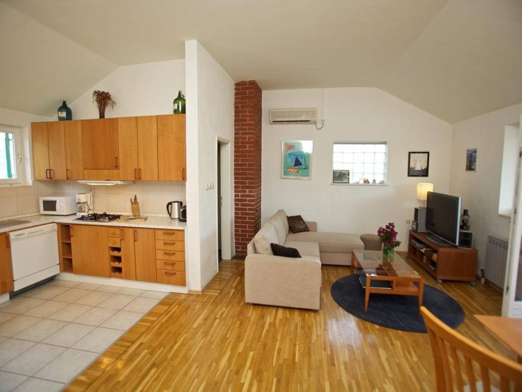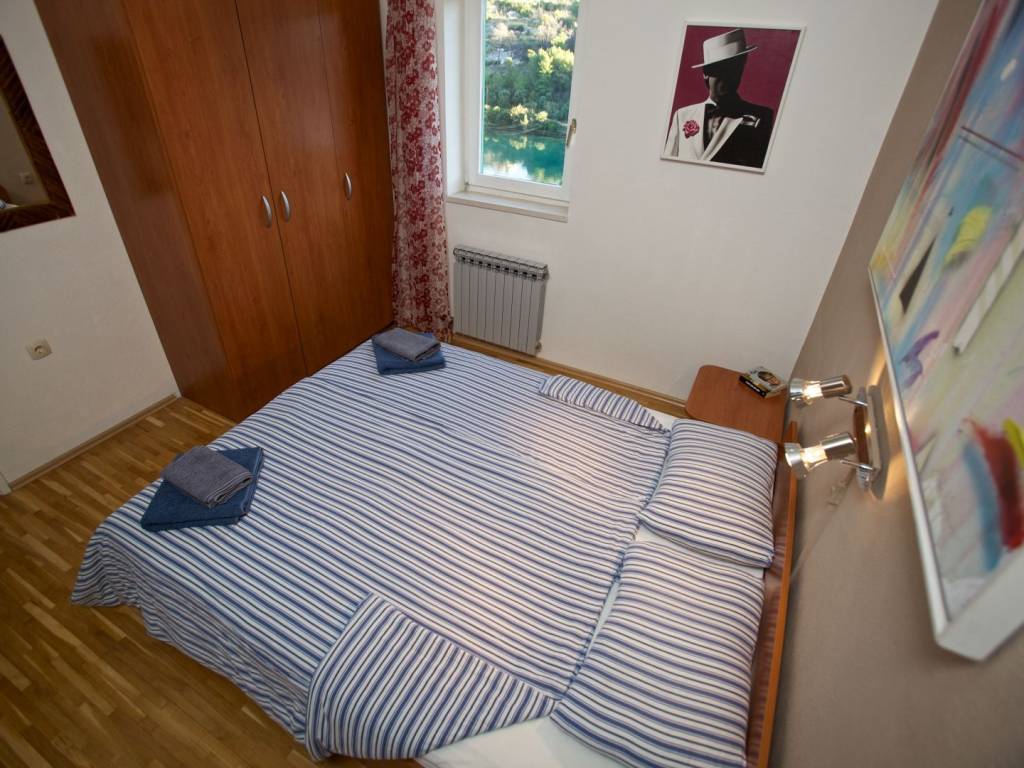 Ulaz na gornji kat neto površine 82 m2 je sa stražnje strane kuće gdje je smještena otvorena terasa i lijepo uređeni, popločeni vrt sa roštiljem. Stan se sastoji od ulaznog hodnika, kuhinje, dvije spavaće sobe i dnevnog boravka iz kojeg se izlazi na natkrivenu terasu sa predivnim pogledom prema moru.
