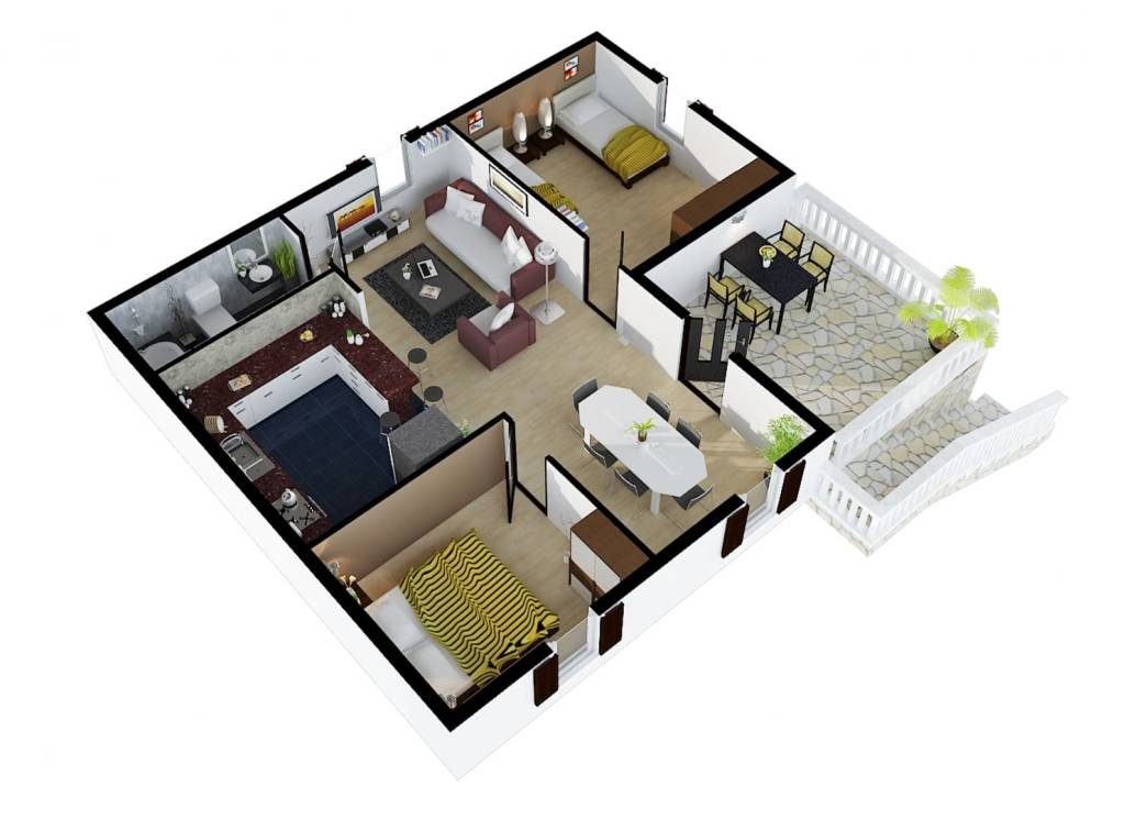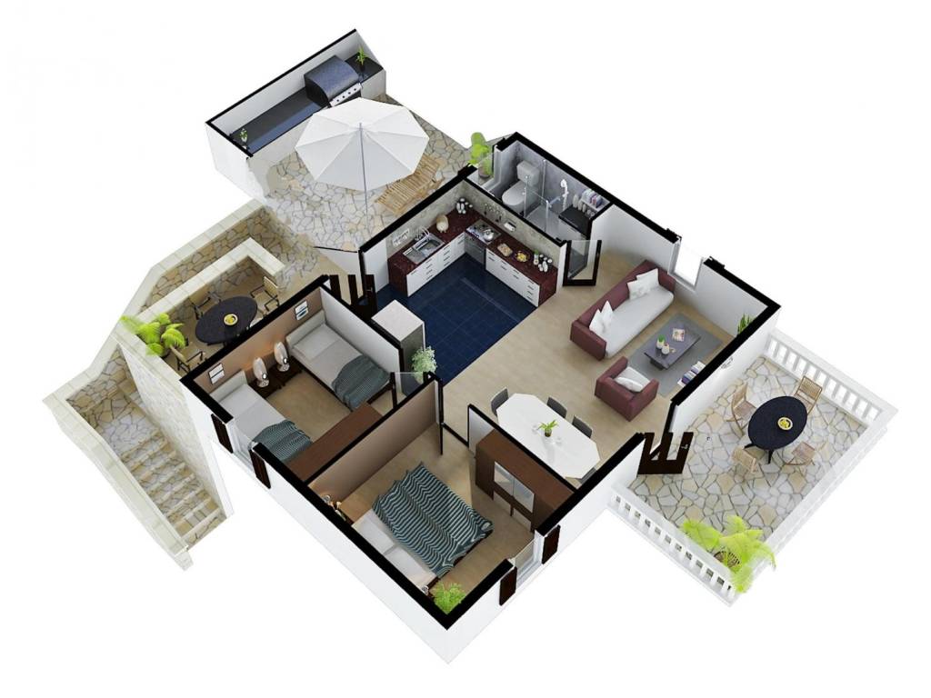 Stan na katu, ukupne neto površine 101 m2, sastoji se od dnevnog boravka sa blagovaonicom, kuhinje, dvije spavaće sobe, kupaonice, spremišta te velike natkrivene terase orijentirane prema moru.