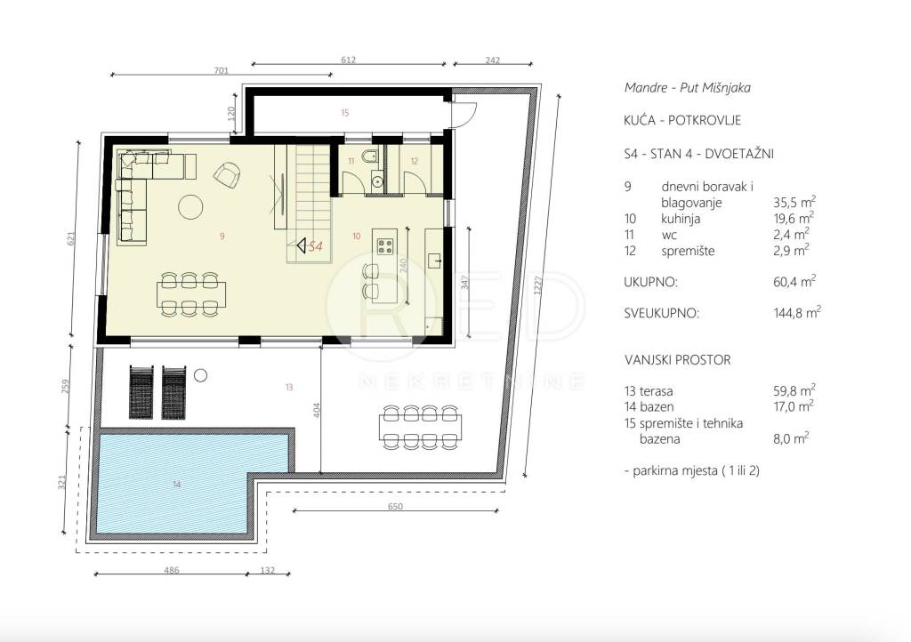 Površine Bruto površina stana je 229.6m2 Grijani prostor stana je 144.8 m2