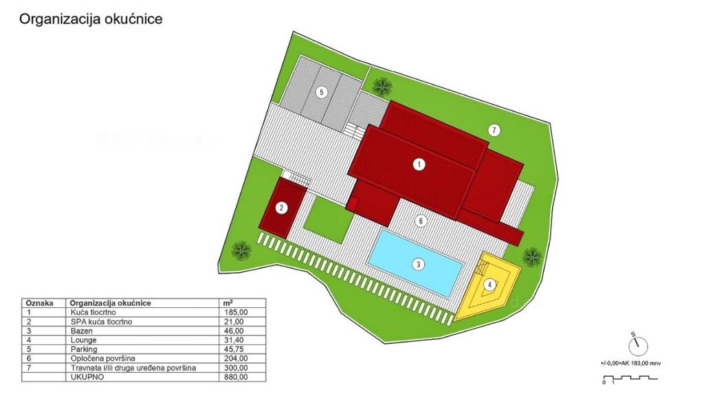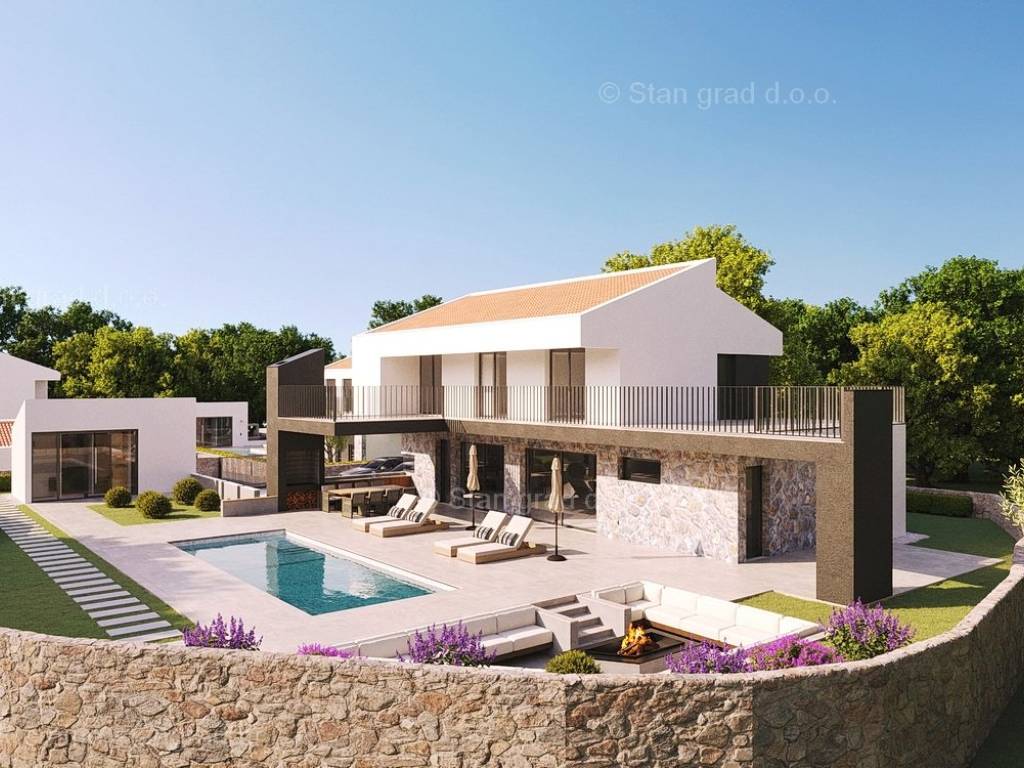Preostali dio kompletno uređene okućnice u površini približno 504 m2 upotpunjava veliki grijani bazen površine 46 m2 sa sunčalištem te lounge prostorom za opuštanje sa ložištem u sredini. Na dvorištu ove kuće uređeno je prostrano mjesto za komotno parkiranje minimalno 2 vozila. Nekretninu karakterizira visokokvalitetna gradnja te vrhunska oprema. Vila će biti opremljena kvalitetnom stolarijom, podnim oblozima od kvalitetne keramike i kamena, vrhunskim sanitarijama, stropnim klimama i podnim grijanjem na dizalicu topline. Sam okoliš će biti lijepo uređen mediteranskim biljem i zelenim površinama.
