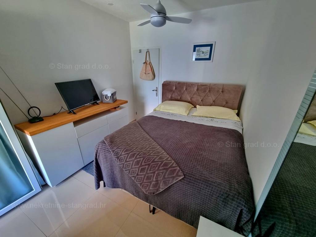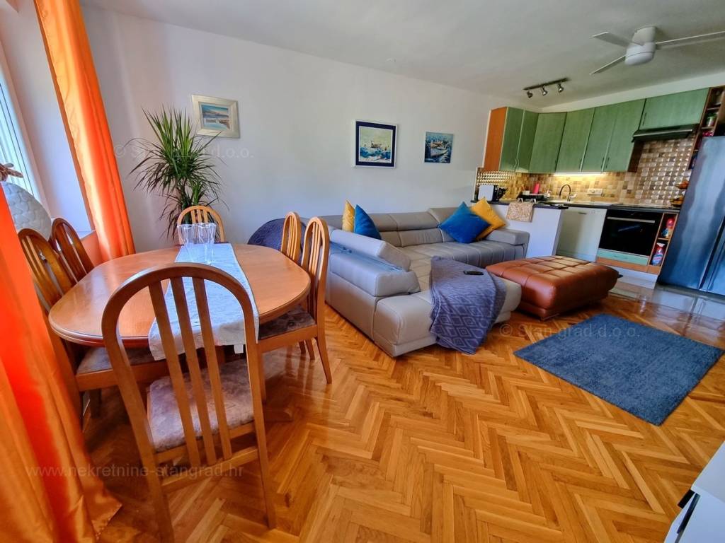 Na prodaji kod agencije Stan Grad Immobilien je vrlo dobar apartman u mediteranskoj regiji otok Krk, tradicionalno atraktivnom području za turistički boravak na hrvatskom Jadranu. Ovaj je apartman sagrađen na kvalitetnoj lokaciji na području grada Njivice, nedaleko mora i sadržaja potrebnih za turistički boravak i svakodnevni život. Ovo je vrlo udobni, srednje veliki jednoetažni apartman vrlo dobrog rasporeda. Unutar solidno izgrađenog objekta, apartman je smješten na 3. etaži. Površina ovog apartmana iznosi ukupno 46,86 m2. U toj su površini obuhvaćeni dnevni boravak i kuhinja, 1 spavaća soba, kupaonica i balkona. Nekretnina je iznutra recentno renovirana promjenom svih instalacija, PVC stolarijom, električnim roletama, a prostor opremljen dobrim namještajem i aparatima. Vlasnik apartmana može neometano koristiti sve pripadajuće zajedničke dijelove i prostore nekretnine. Vlasnik apartmana ima mogućnost parkiranja vozila na javnoj površini u blizini apartmana. Ponad opisanih karakteristika, nekretnina je i pogodne orijentacije, pa osigurava vrlo lijep pogled na simpatično primorsko naselje. Ovaj apartman je u vlasništvu fizičke osobe i na ime njegovog prijenosa kupac je u obvezi plaćanja poreza na promet nekretnine u visini 3%. Prodavatelj nekretnine garantira brz prijenos vlasničkih prava te urednu vlasničku i tehničku dokumentaciju. Vaš partner Stan Grad Immobilien srdačno će vas dočekati na Kvarneru i pobrinuti za Vaš siguran i uspješan osjećaj kupovine nekretnine. Osim traženja i prezentacije idealne nekretnine za Vas, naš će vam posrednički ured asistirati u prijenosu računa za komunalije i uknjižbi vlasništva apartmana.