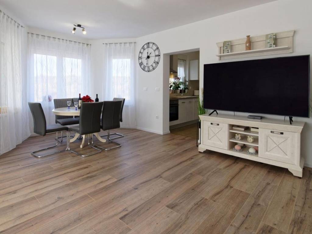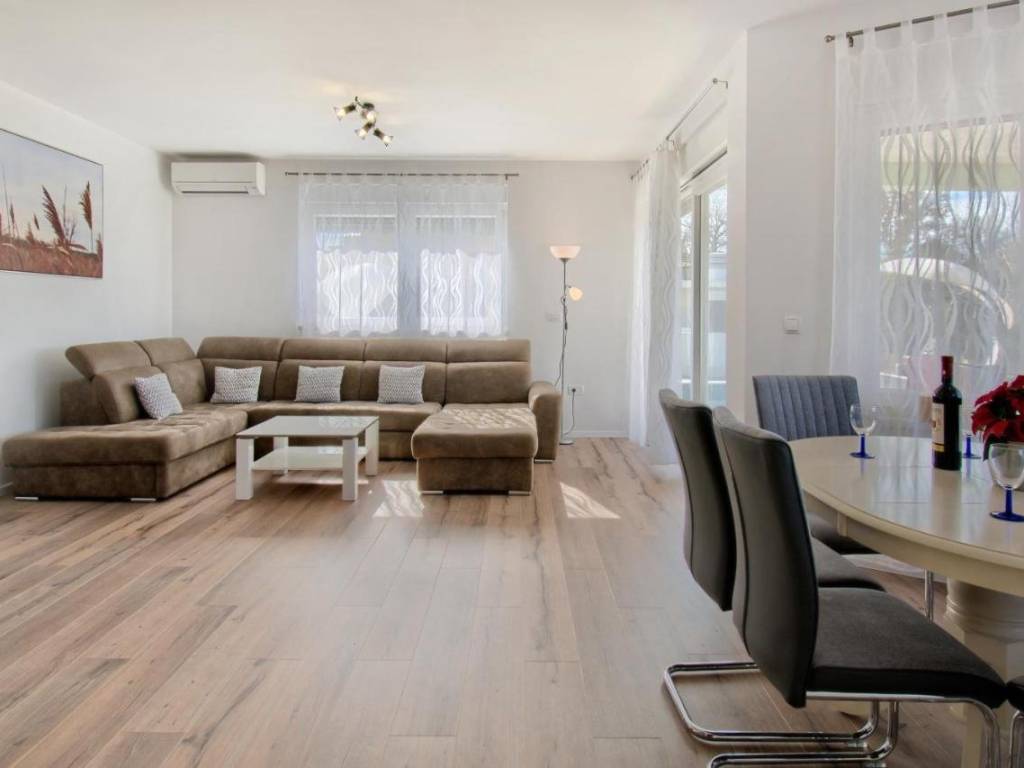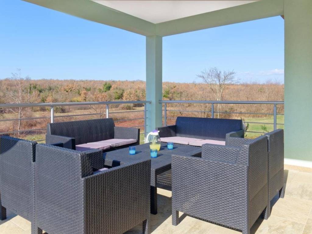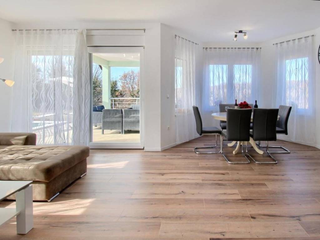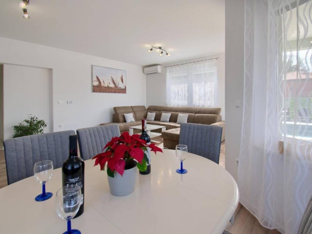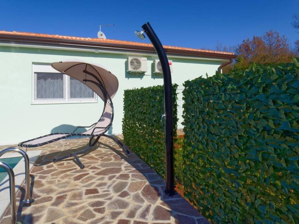 Sastoji se od 3 spavaće sobe, 2 kupaonice, kuhinje, dnevnog boravka, ostave, velike terase s izlazom na bazen (24 m2) i sunčalište.