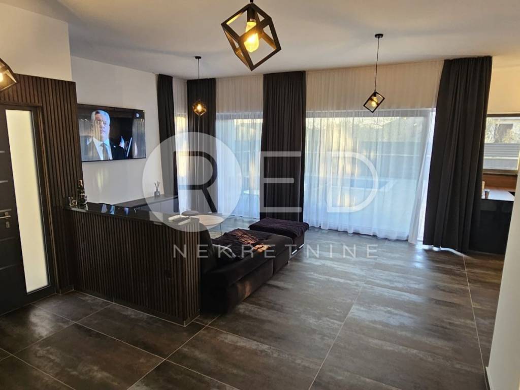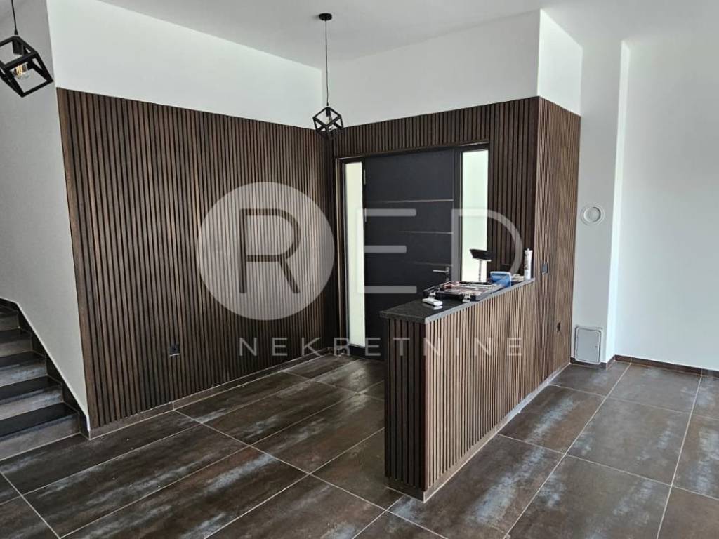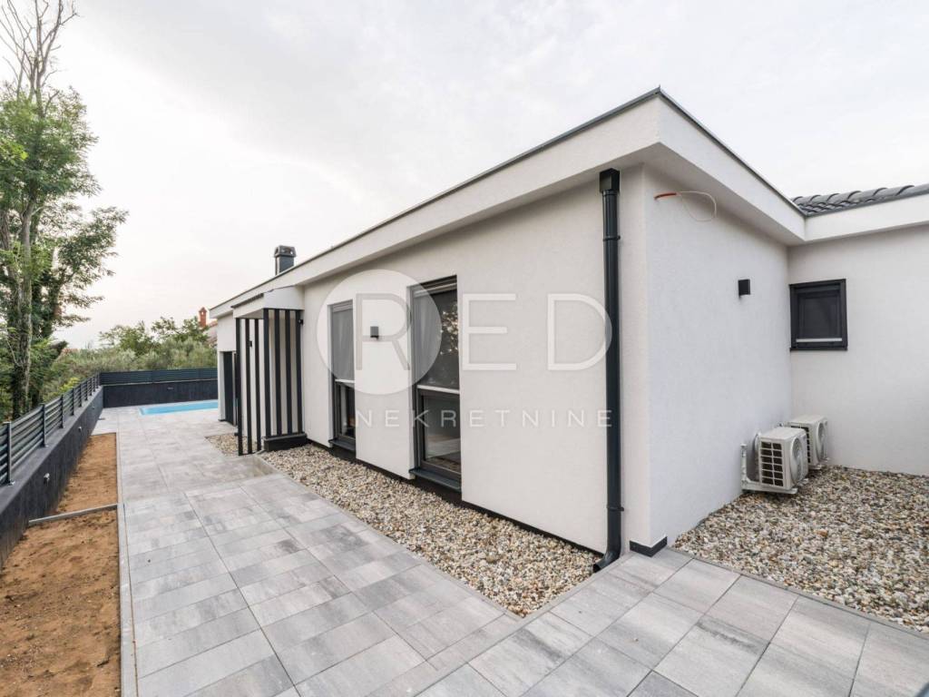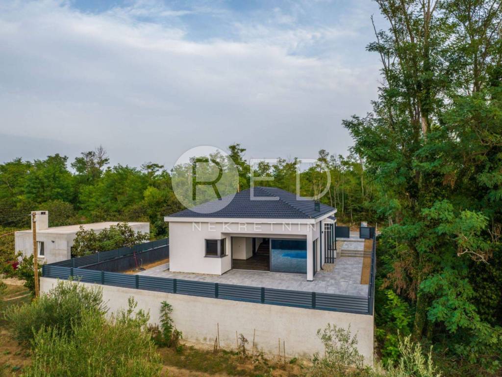 Terasa s bazenom idealna je za opuštanje, dok privatno dvorište s parkirnim mjestom pruža dodatnu udobnost. Kuća je u potpunosti klimatizirana i opremljena podnim grijanjem. Kvalitetni materijali uključuju keramičke pločice i vrhunsku PVC stolariju Rehau Synego.