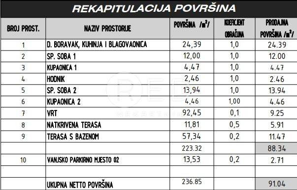 - Dnevnog boravka s kuhinjom i blagovaonicom - 2 Spavaće sobe - 2 Kupaonice - Hodnika - Natkrivene terase - Terase s bazenom - Vrta