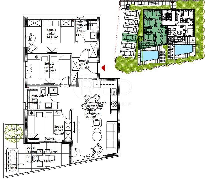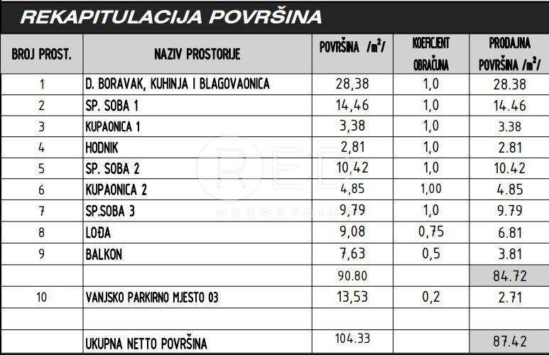 - Dnevnog boravka s kuhinjom i blagovaonicom - 3 Spavaće sobe - 2 Kupaonice - Hodnika - loggie - balkona