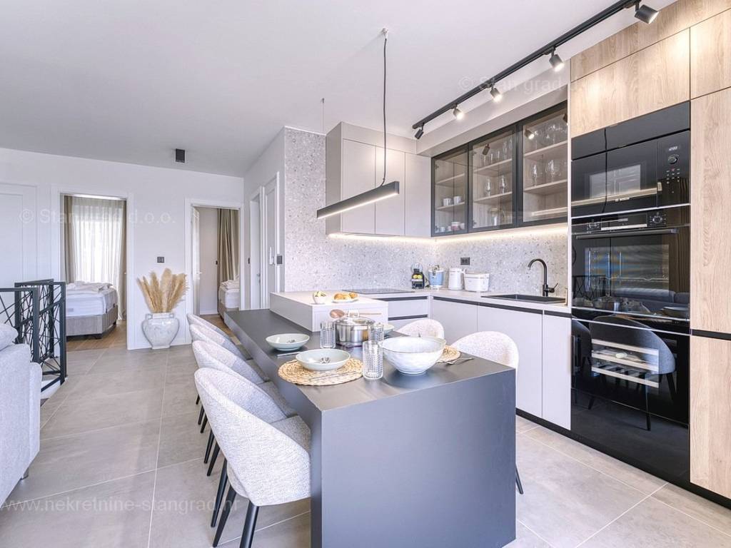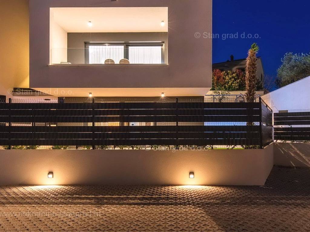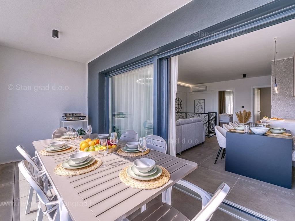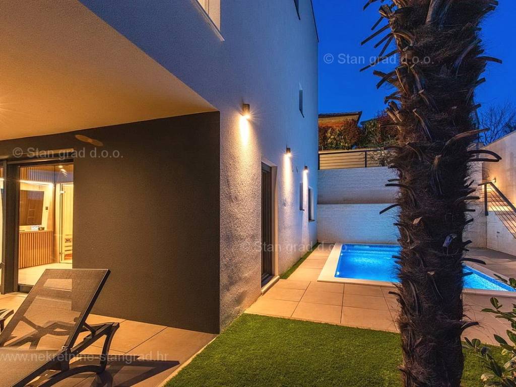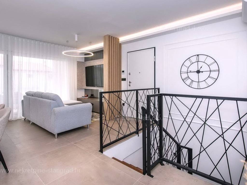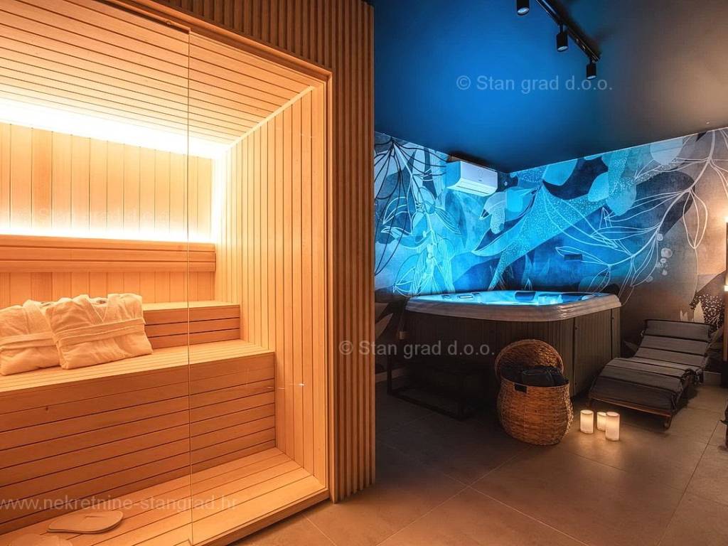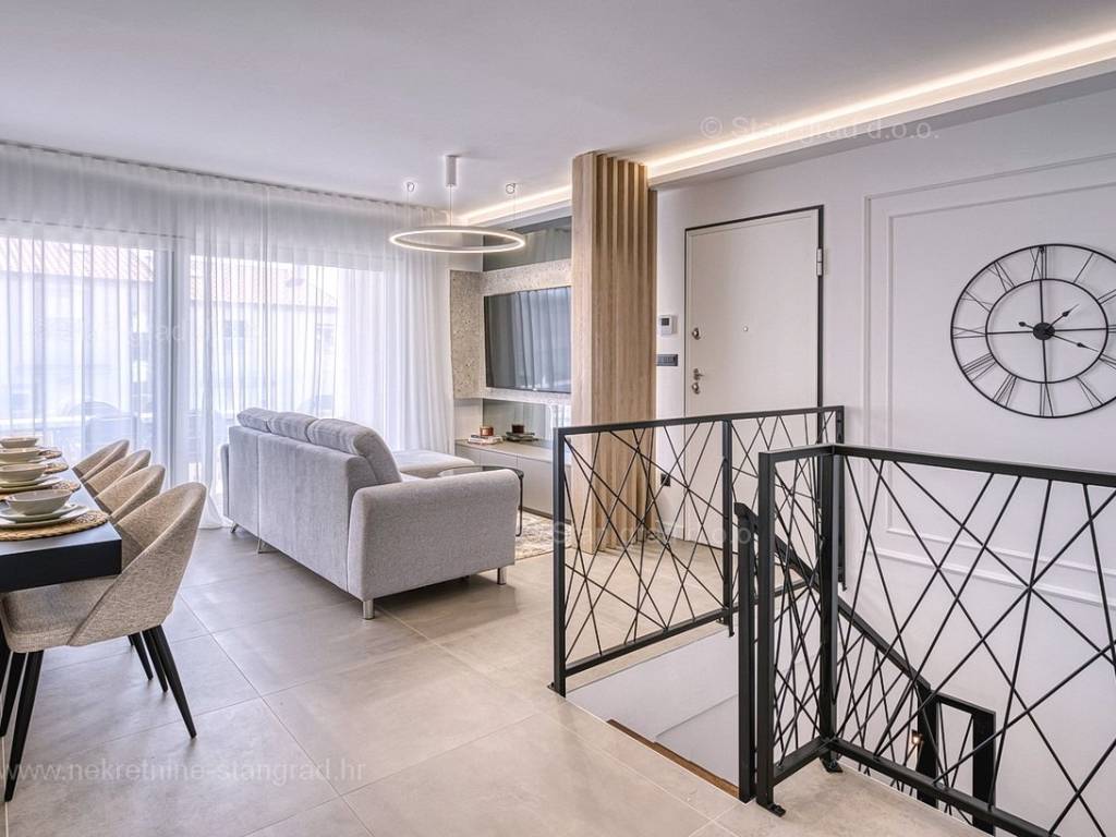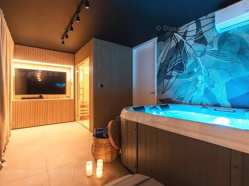 U okviru moderno projektirane građevine, apartman se pruža preko prizemne i 1. etaže. Apartman obuhvaća ukupnu površinu od približno 118 m2. Navedenom površinom su obuhvaćeni dnevni boravak i kuhinja, 3 spavaće sobe, 3 kupaonice i 2 terase. Također ova nekretnina sadrži i saunu i teretanu. U izvanredno održavani i raskošno namješteni interijer predmetne nekretnine je instaliran bogati set uređaja novije generacije. Posebnu čar ovom apartmanu daje iznimno uređena pripadajuća okućnica koja sadržava bazen i sunčalište te ljetnu kuhinju. U vlasništvu ovog apartmana je uređen parkirni prostor za parkiranje dva automobila.