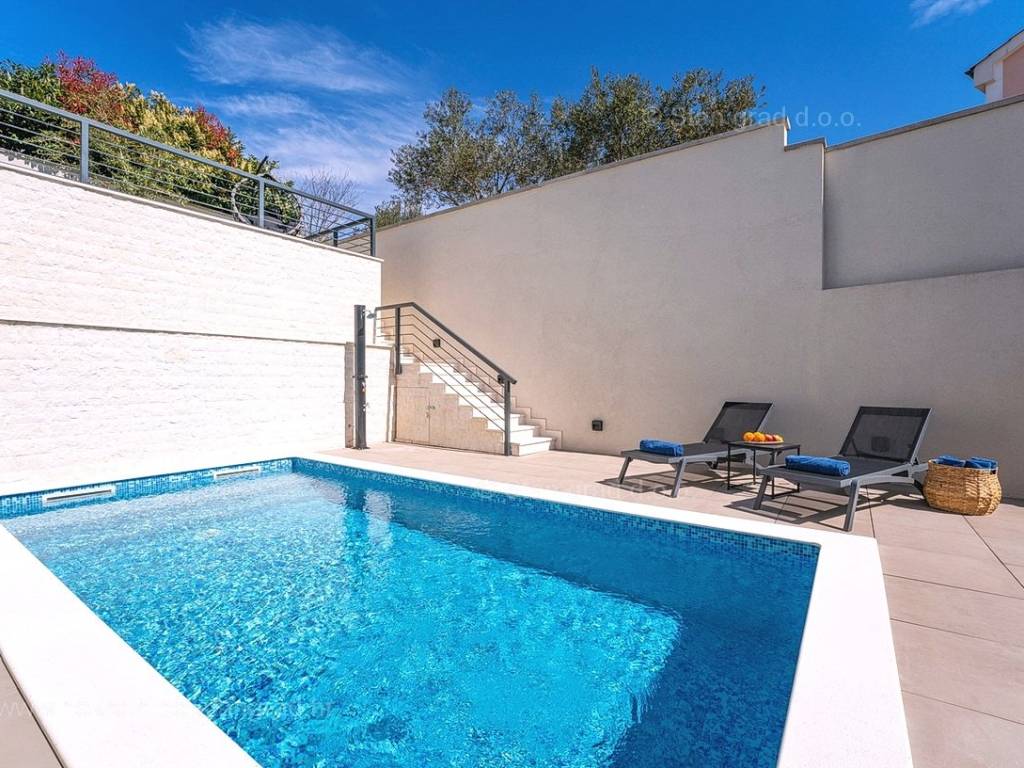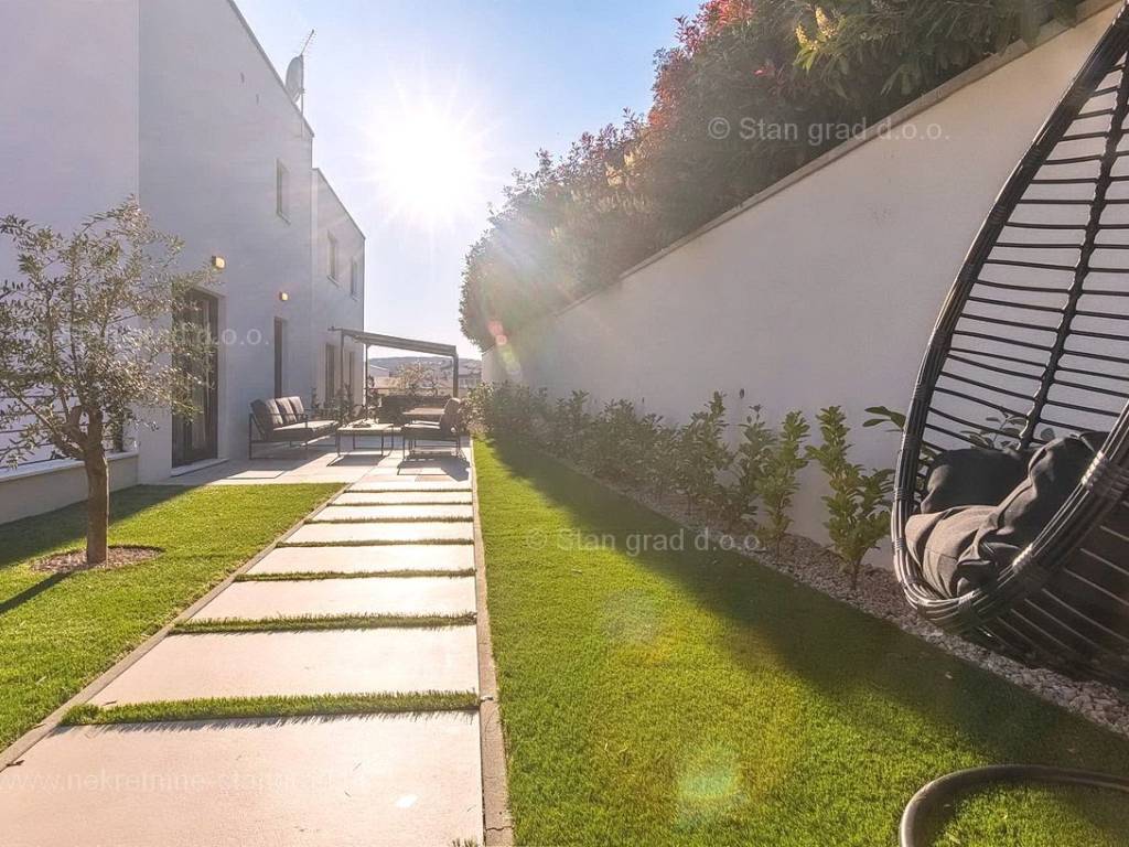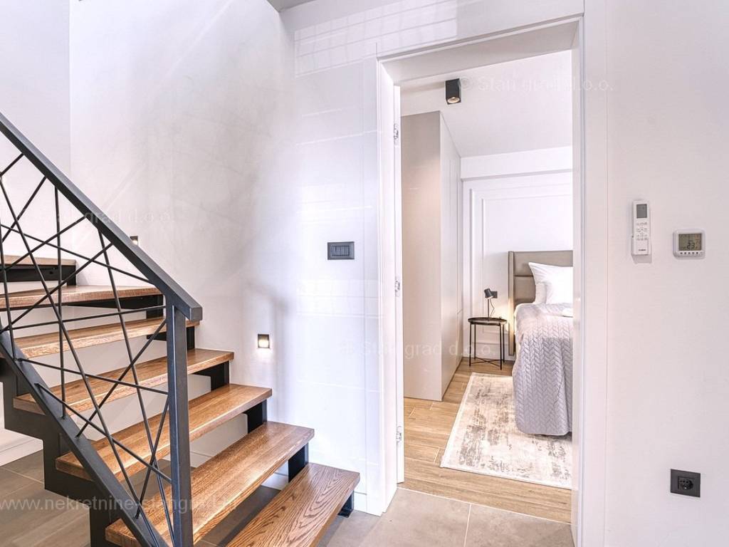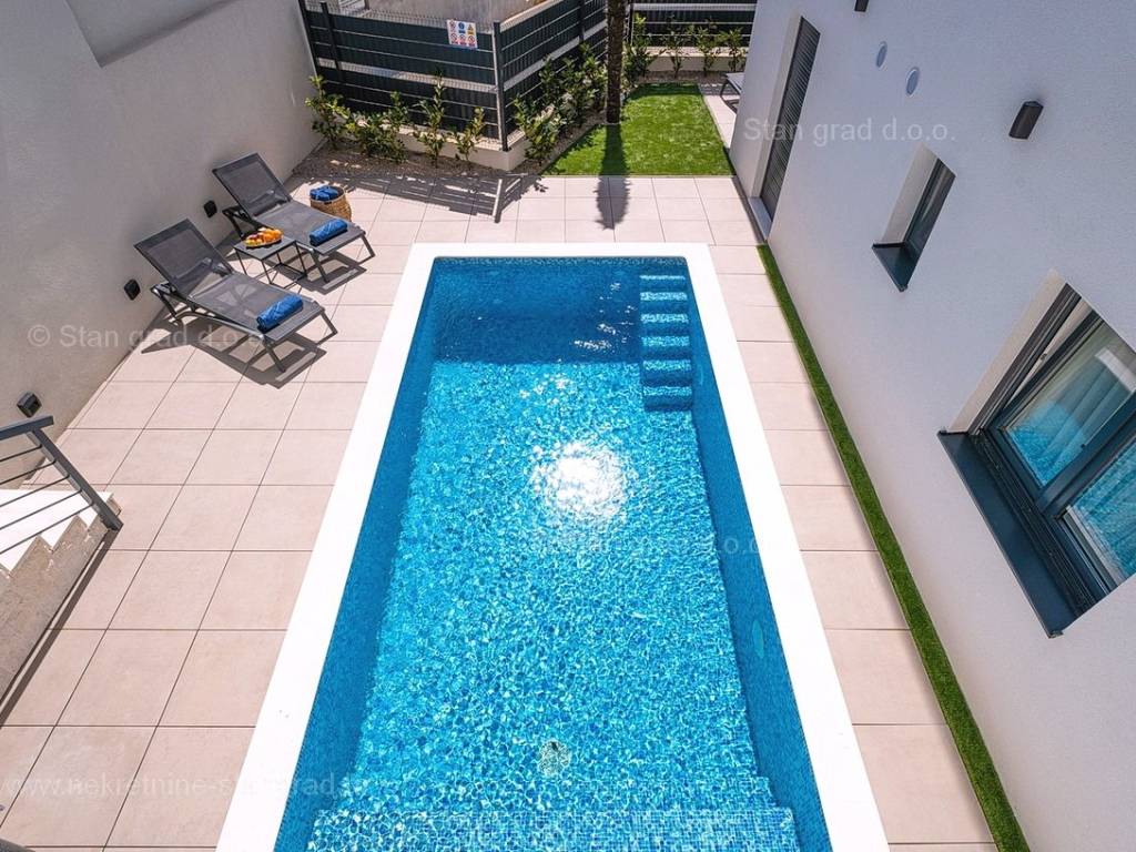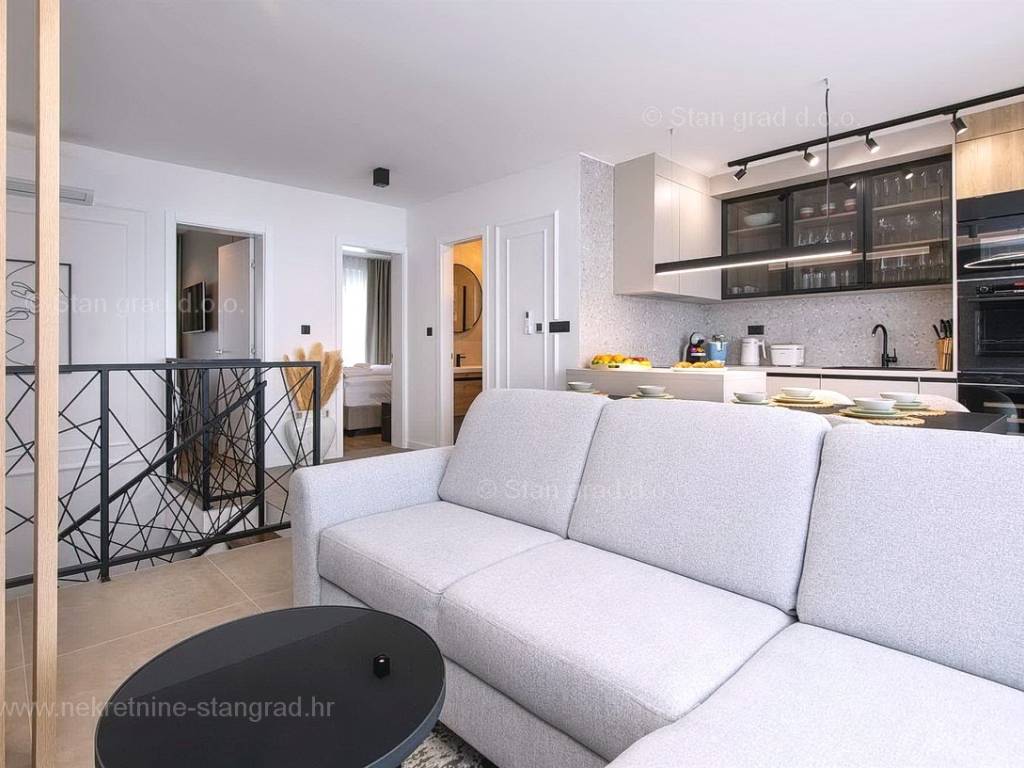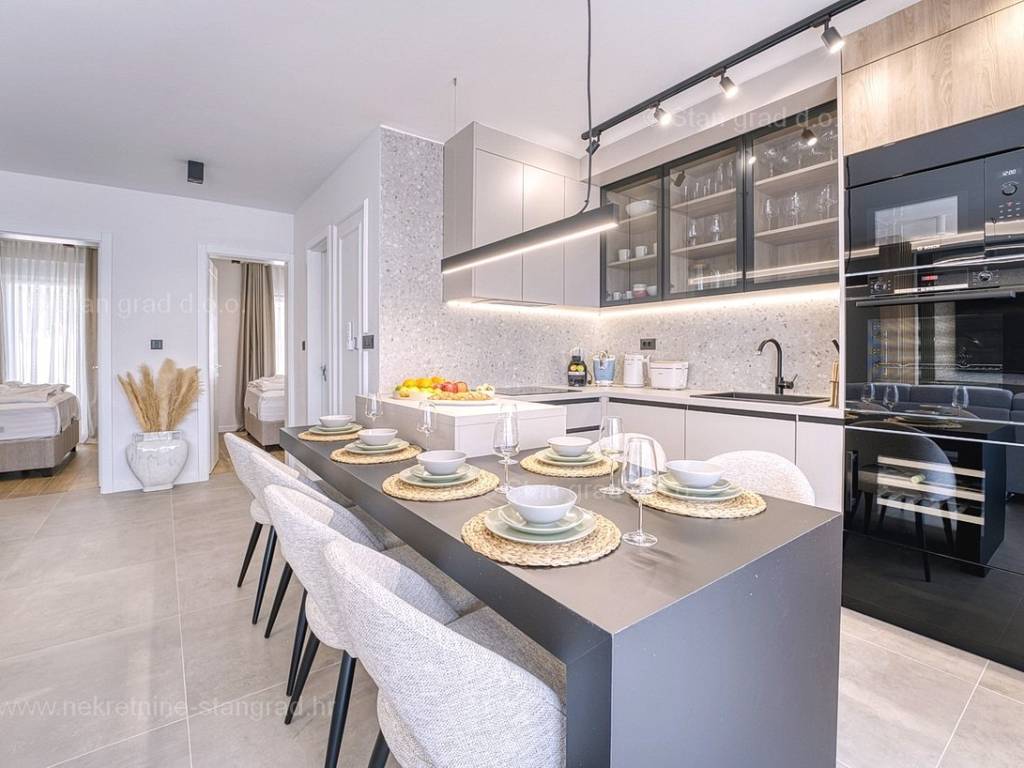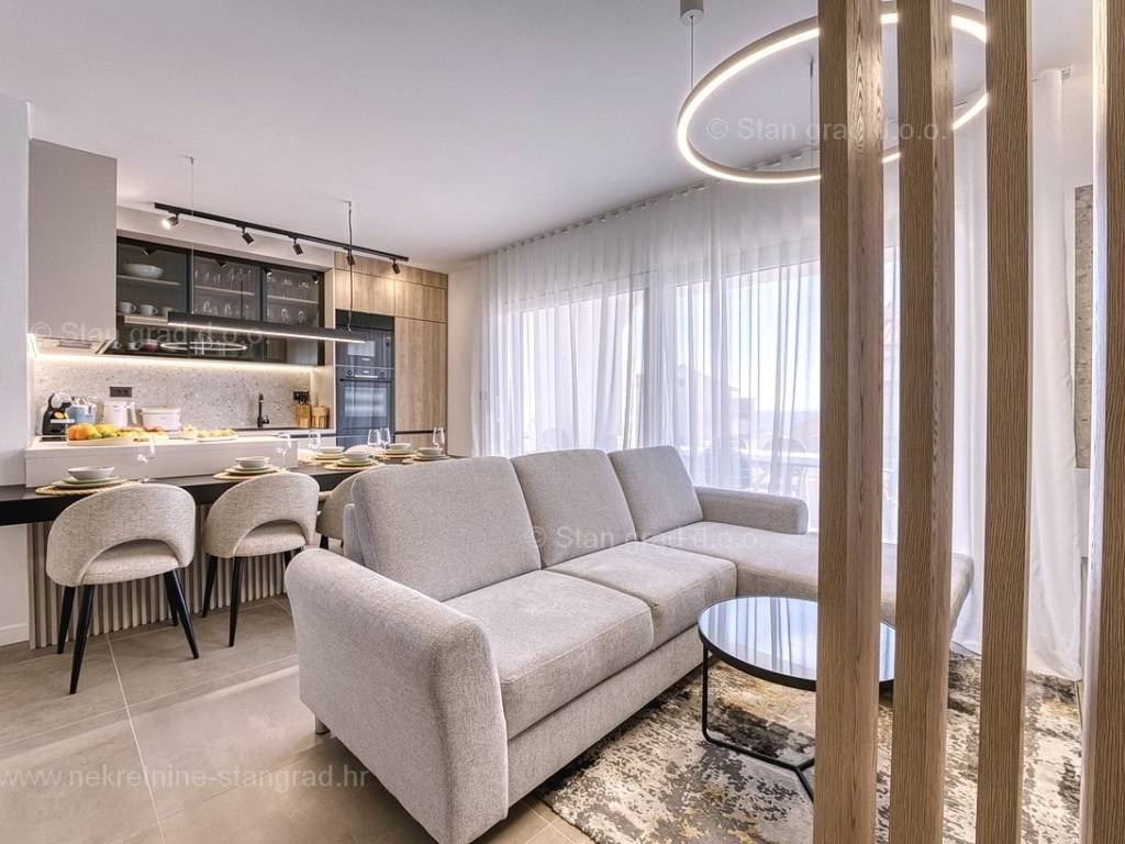U okviru moderno projektirane građevine, apartman se pruža preko prizemne i 1. etaže. Apartman obuhvaća ukupnu površinu od približno 118 m2. Navedenom površinom su obuhvaćeni dnevni boravak i kuhinja, 3 spavaće sobe, 3 kupaonice i 2 terase. Također ova nekretnina sadrži i saunu i teretanu. U izvanredno održavani i raskošno namješteni interijer predmetne nekretnine je instaliran bogati set uređaja novije generacije. Posebnu čar ovom apartmanu daje iznimno uređena pripadajuća okućnica koja sadržava bazen i sunčalište te ljetnu kuhinju. U vlasništvu ovog apartmana je uređen parkirni prostor za parkiranje dva automobila.