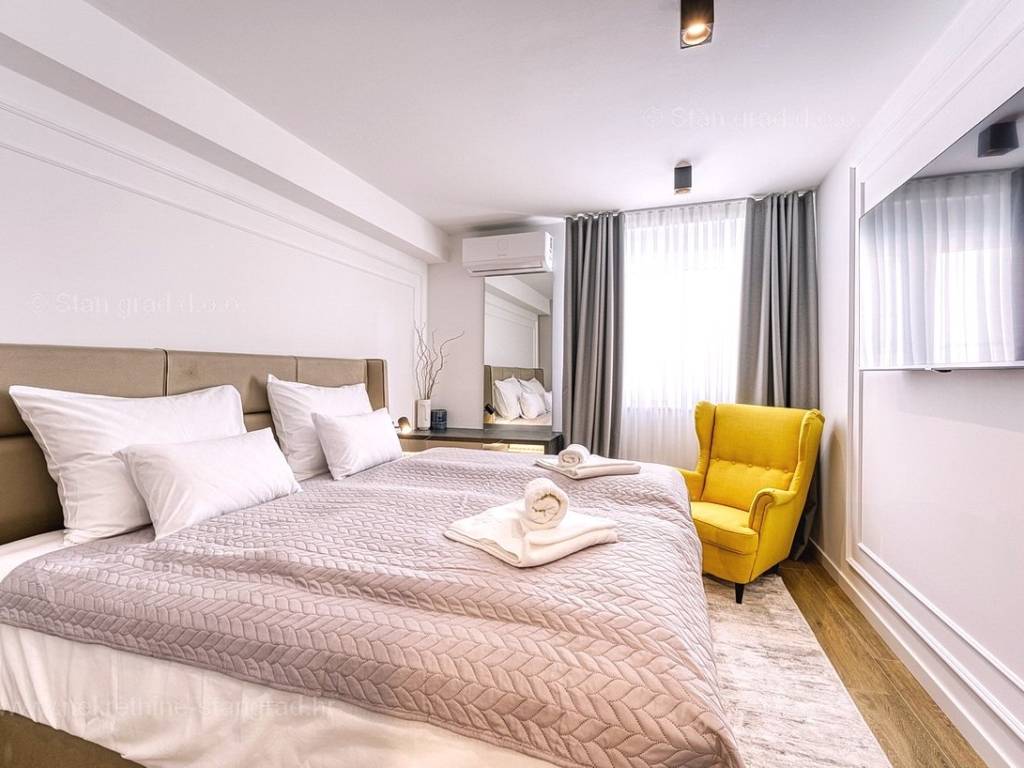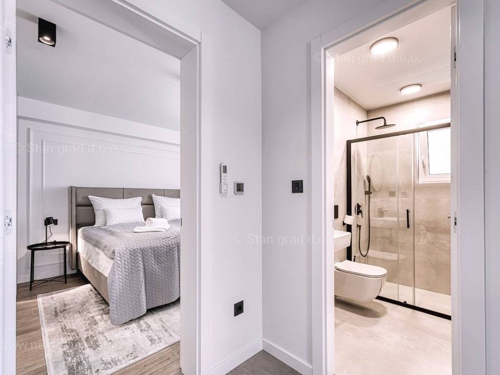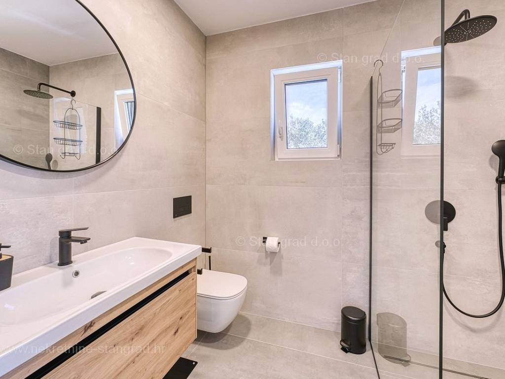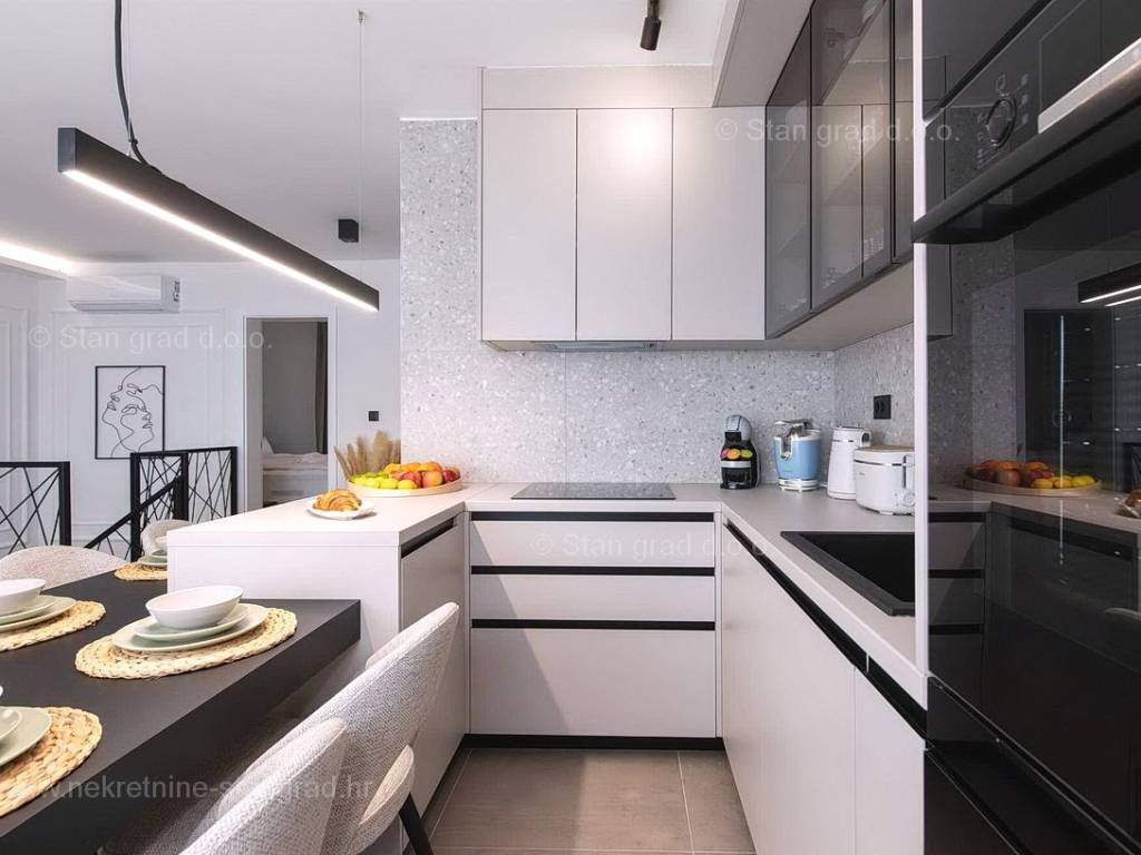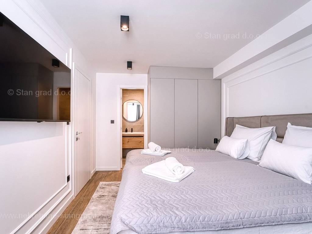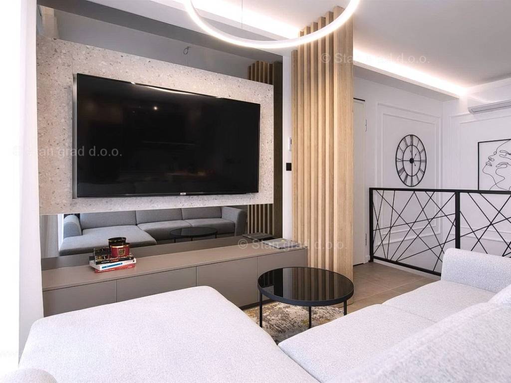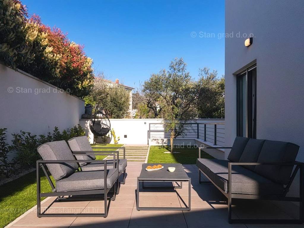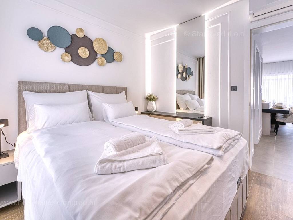 U okviru moderno projektirane građevine, apartman se pruža preko prizemne i 1. etaže. Apartman obuhvaća ukupnu površinu od približno 118 m2. Navedenom površinom su obuhvaćeni dnevni boravak i kuhinja, 3 spavaće sobe, 3 kupaonice i 2 terase. Također ova nekretnina sadrži i saunu i teretanu. U izvanredno održavani i raskošno namješteni interijer predmetne nekretnine je instaliran bogati set uređaja novije generacije. Posebnu čar ovom apartmanu daje iznimno uređena pripadajuća okućnica koja sadržava bazen i sunčalište te ljetnu kuhinju. U vlasništvu ovog apartmana je uređen parkirni prostor za parkiranje dva automobila.