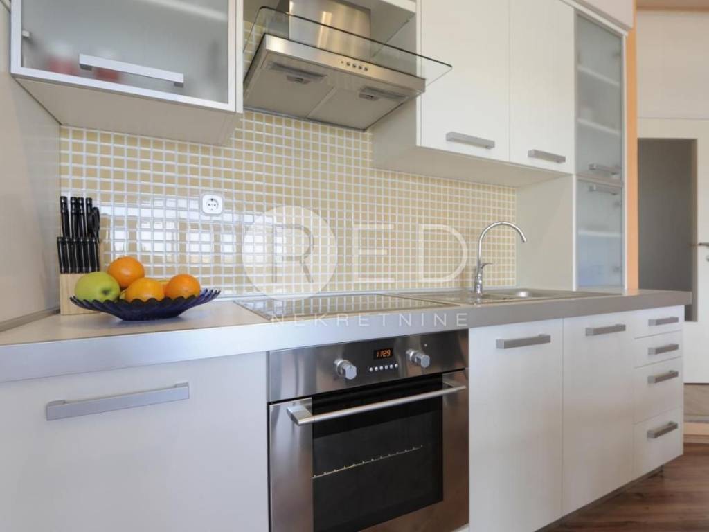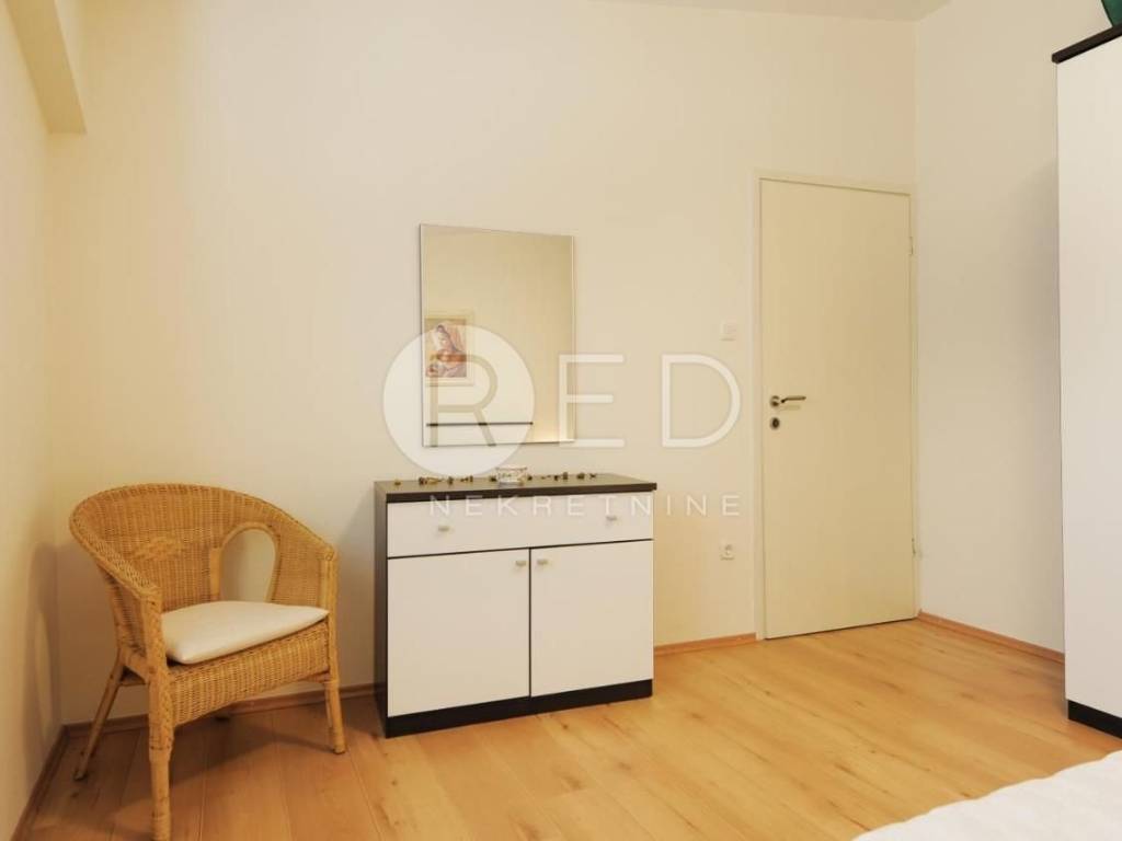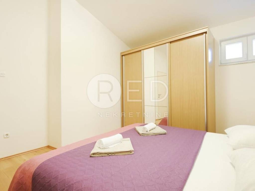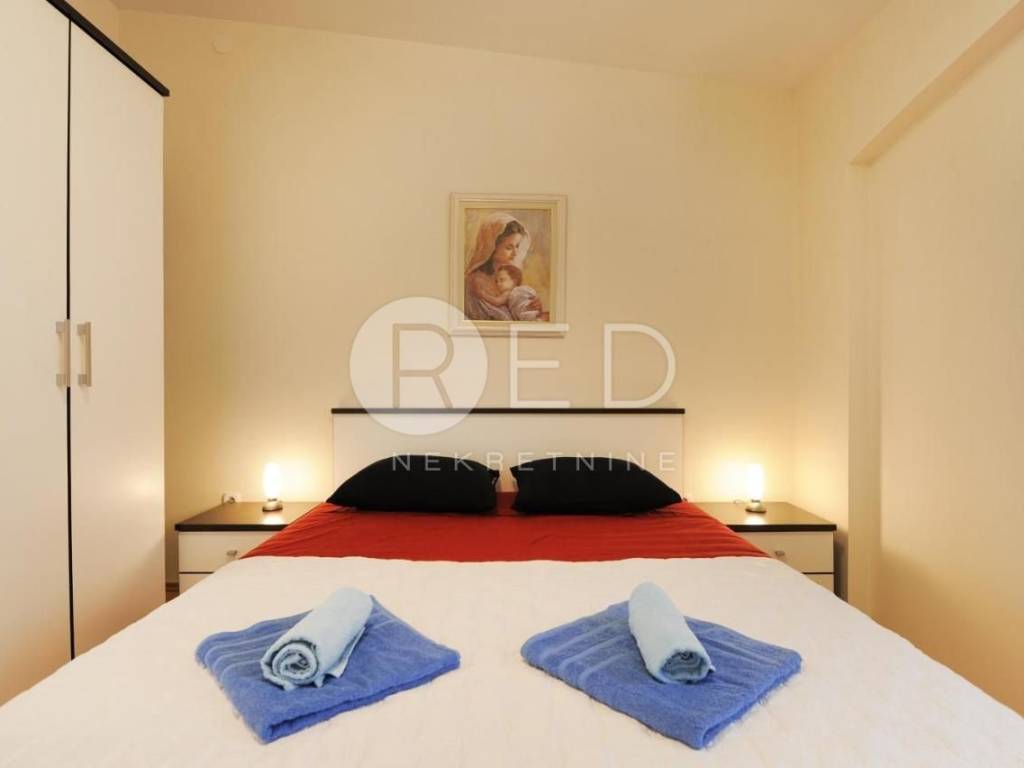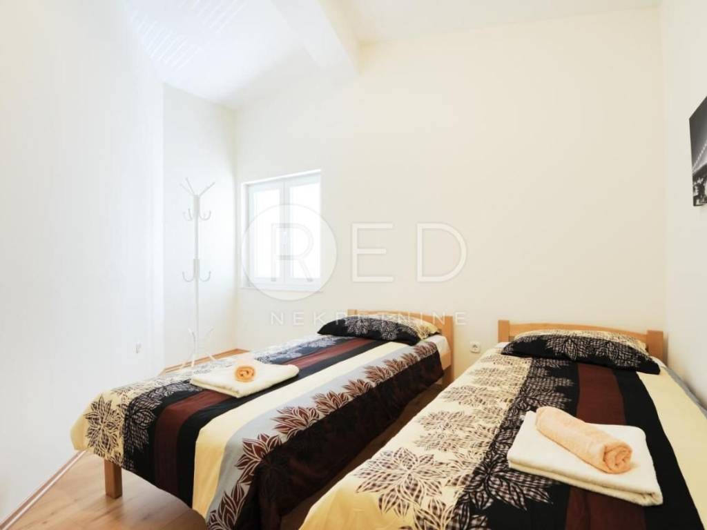 - Apartman na prvom katu se sastoji od kuhinje, dnevnog boravka, hodnika, dvije spavaće sobe, kupaonice i ostave. Posebno se ističe prostrani balkon od 28 m2, s koje se pruža zadivljujući pogled na more. Apartman je kategoriziran s tri zvjezdice i uspješno se koristi u turističke svrhe, ostvarujući izvrsne rezultate.