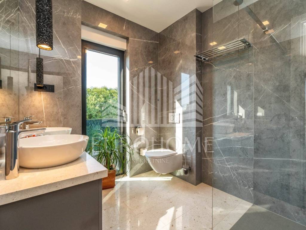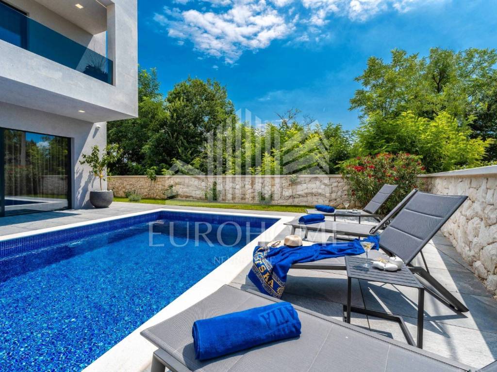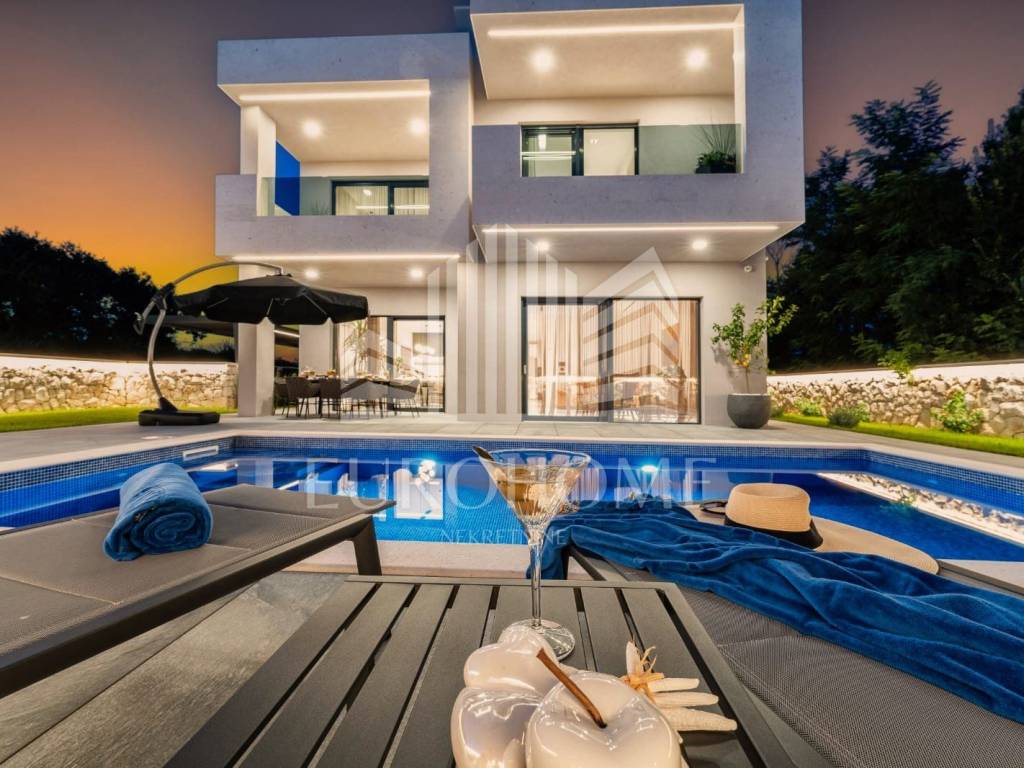 Lijepo uređena okućnica ove vile nudi privatni bazen sa grijanom vodom Grijanje, hlađenje i priprema tople vode u bazenu su riješeni preko dizalice topline i kanalskih ventilokonvektora a na svim unutarnjim površinama je izvedeno podno grijanje. Uz bazen se nalazi prostrano sunčalište.