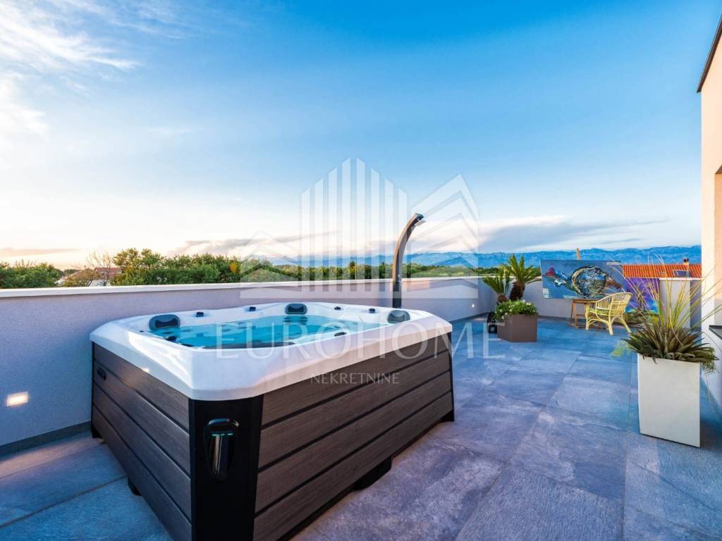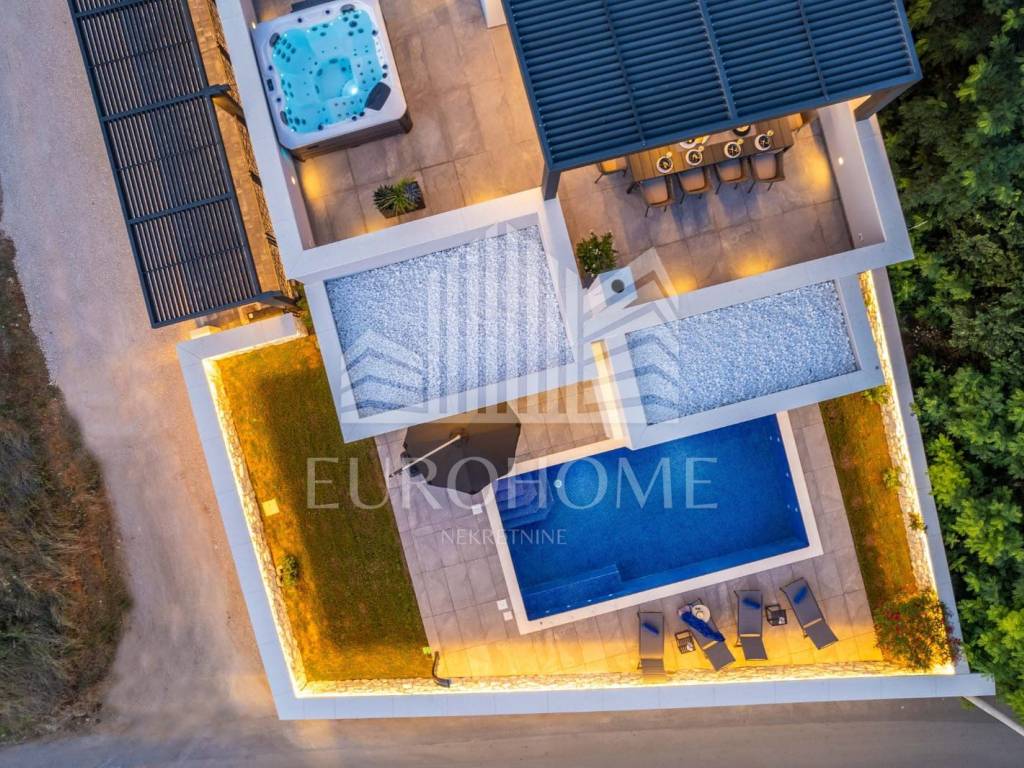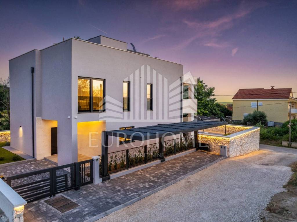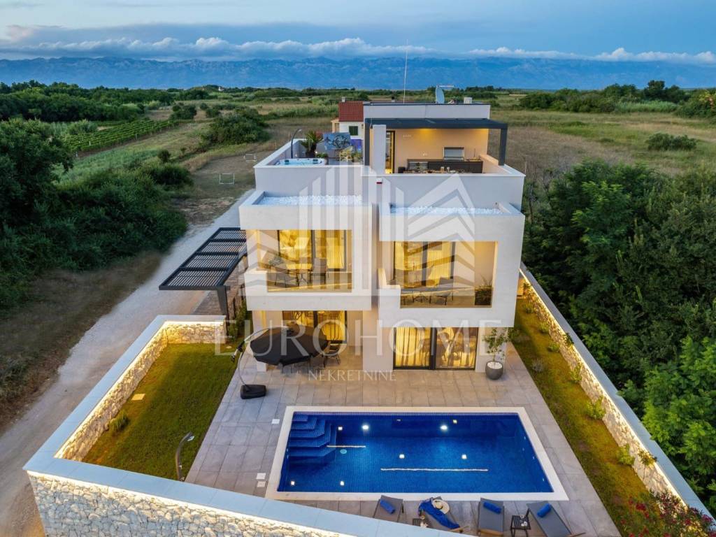 Prodaje se luksuzna vila s bazenom, u mjestu Privlaka kod Zadra. Smještena je na prekrasnoj lokaciji, u mirnom i tihom okruženju na svega 800 metara od mora, a iz nje se pruža predivan panoramski pogled na Zadarske otoke i otvoreno more. Vila je kompletno namještena i uređena. Sastoji se od prizemlja, 1. kata i krovne terase. Prizemlje neto površine 121m2 sastoji se od kuhinje, dnevnog boravka, blagovaonice, kupaonice, praonice i prostorije u kojoj je smještena strojarnica podnog grijanja i priprema tople vode sa spremnikom. Na prvom katu su 4 spavaće sobe s vlastitim kupaonicama. Gornja etaža ima 130,43m2. Nadalje, unutarnje stepenice vode na krovnu terasu veličine 117m2. Na krovnoj terasi se nalazi natkriveni prostor sa vanjskom kuhinjom i plinskim roštiljem te stolom a na nenatkrivenom dijelu je masažna kada i sunčalište. Vila ima neto korisnu površinu od 370 m2.
