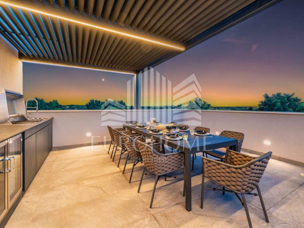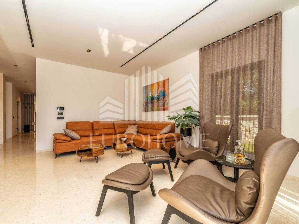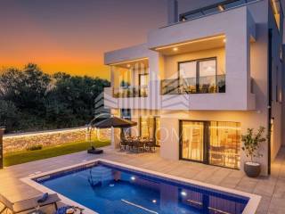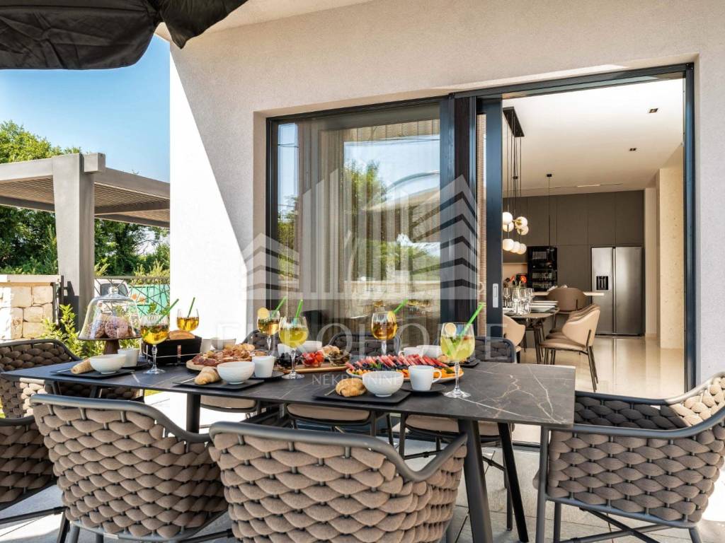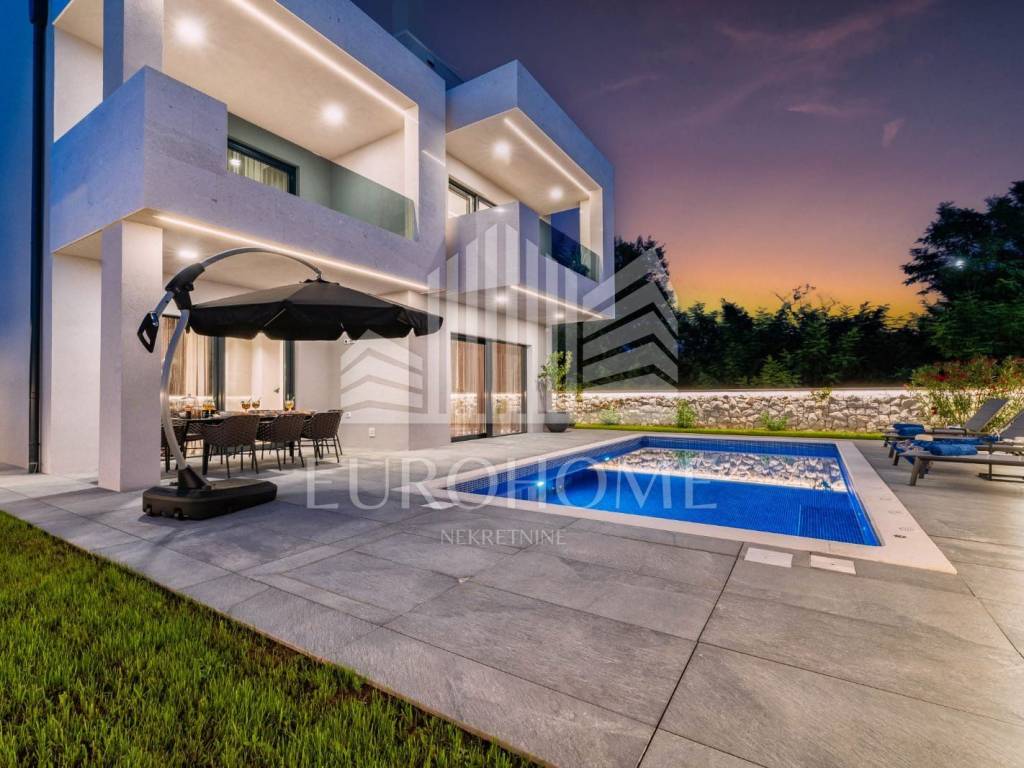 Prodaje se luksuzna vila s bazenom, u mjestu Privlaka kod Zadra. Smještena je na prekrasnoj lokaciji, u mirnom i tihom okruženju na svega 800 metara od mora, a iz nje se pruža predivan panoramski pogled na Zadarske otoke i otvoreno more. Vila je kompletno namještena i uređena. Sastoji se od prizemlja, 1. kata i krovne terase. Prizemlje neto površine 121m2 sastoji se od kuhinje, dnevnog boravka, blagovaonice, kupaonice, praonice i prostorije u kojoj je smještena strojarnica podnog grijanja i priprema tople vode sa spremnikom. Na prvom katu su 4 spavaće sobe s vlastitim kupaonicama. Gornja etaža ima 130,43m2. Nadalje, unutarnje stepenice vode na krovnu terasu veličine 117m2. Na krovnoj terasi se nalazi natkriveni prostor sa vanjskom kuhinjom i plinskim roštiljem te stolom a na nenatkrivenom dijelu je masažna kada i sunčalište. Vila ima neto korisnu površinu od 370 m2.