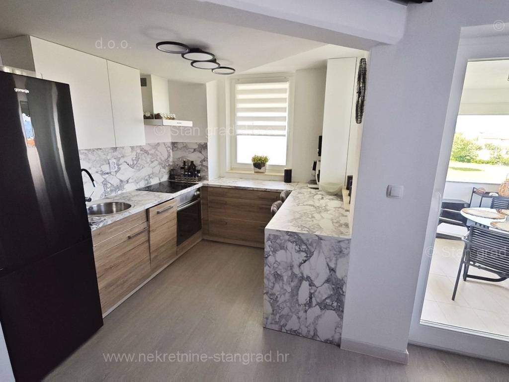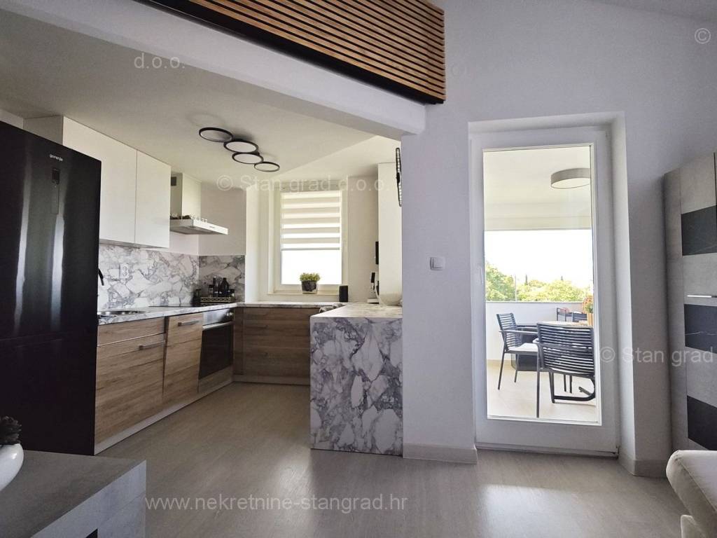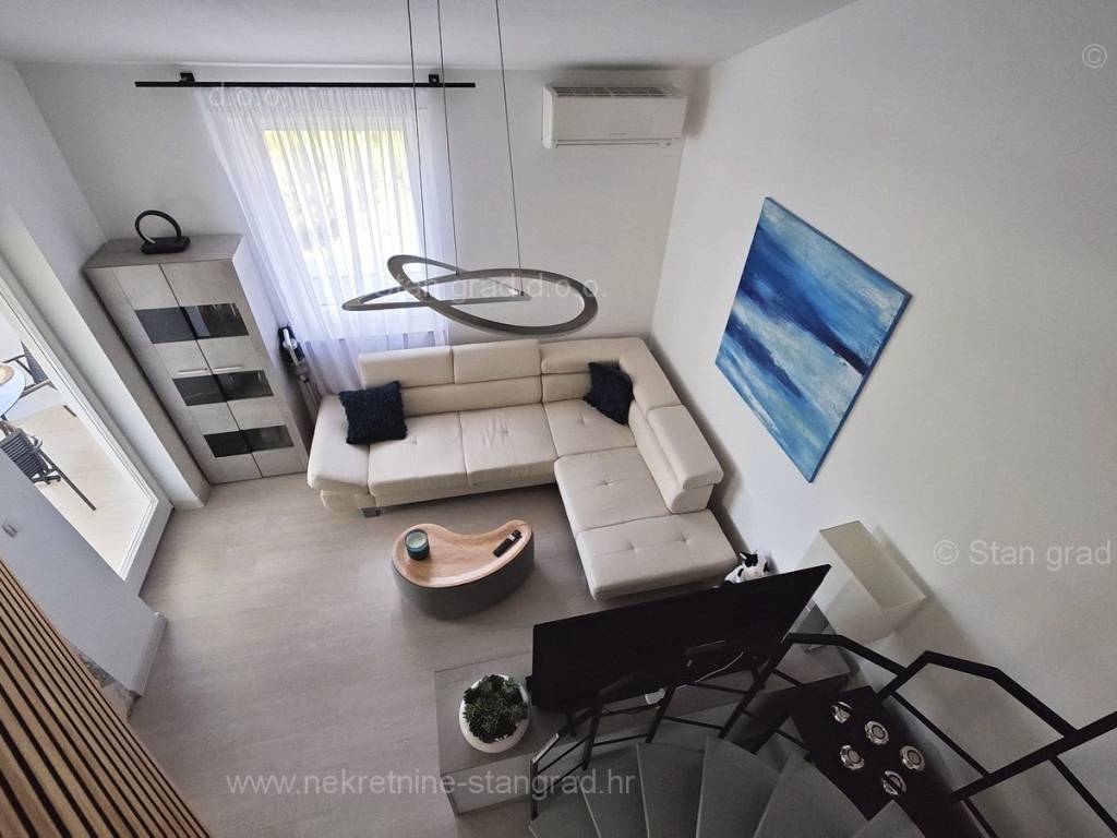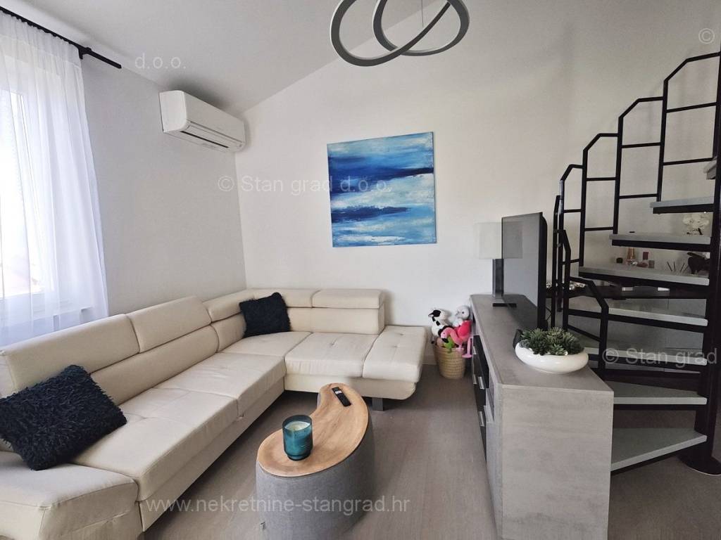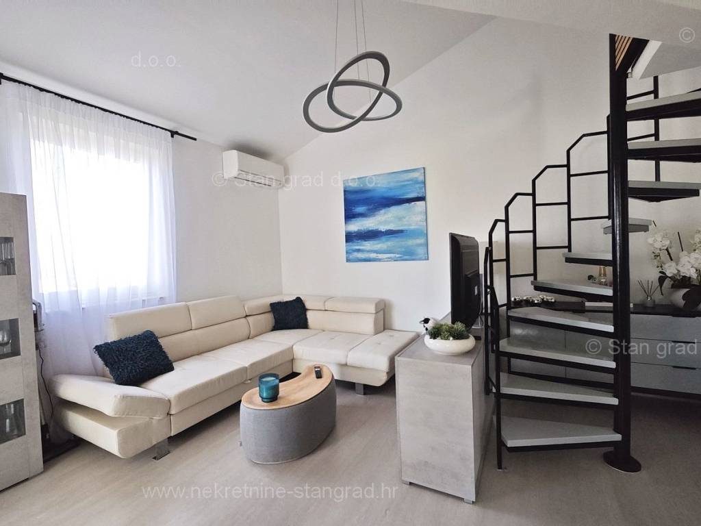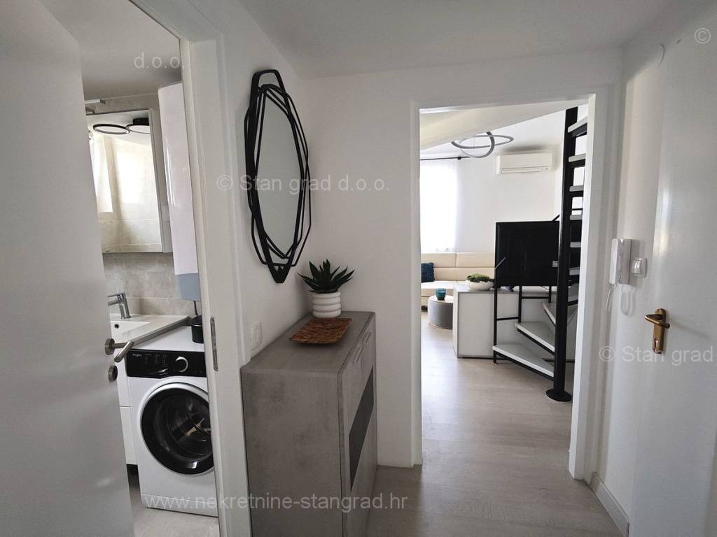 U ponudi naše agencije na super atraktivnom sjevernojadranskom području Otok Krk se prodaje potpuno uređen apartman koji pruža savršen ugođaj provođenja godišnjih i vikend odmora. Predmetna nekretnina je lijepo uklopljena u lijepo planirani prostor simpatičnog mediteranskog naselja nedaleko središta mjesta Malinska i svih potrebnih sadržaja. Po vrsti nekretnine, to je dvoetažni apartman s unutarnjim stepenicama. Apartman zauzima ukupnu površinu od približno 47 m2, u naravi je ta površina nešto veća od 65 m2. Sastoji se od hodnika, dnevnog boravka, kuhinje, sobe, kupaonice, velike terase s pogledom na more te unutarnjih stepenica koje vode na galeriju gdje je još jedna spavaća soba. Interijer nekretnine je kompletno opremljen novim, kvalitetnim tehničkim uređajima te jedinstveno oblikovanim namještajem. Vlasnik apartmana na raspolaganju ima jedno parkirno mjesto. Uz prethodne tehničke i prostorne značajke, značajno je izdvojiti i lijepu orijentaciju apartmana koja nudi ugodan pogled na more i prirodu. Ovaj apartman je u vlasništvu fizičke osobe i na ime njegovog prijenosa kupac je u obvezi plaćanja poreza na promet nekretnine u visini 3%. Prodavatelj nekretnine jamči urednu građevinsku i vlasničku dokumentaciju te brz prijenos nekretnine na ime kupca. Najavite se i rado ćemo vas primiti u našem uredu na otoku Krku. Poklonite li nam svoje povjerenje, agencija Stan Grad Immobilien rado će vam pomoći u prijenosu vlasničkih prava ove nekretnine te računa za njene komunalne priključke i usluge na vaše ime.
