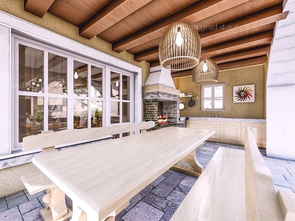 Dodanu vrijednost ovom cijelom objektu daje okućnica oplemenjena bazenom i natkrivena ljetna kuhinja te spremište sa zasebnim ulazom. Na okućnici opisane nekretnine mogu se komforno parkirati dva automobila. Osim ranijih karakteristika, važno je kazati kuća ima lijep pogled na more i priobalje.