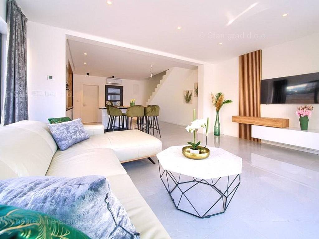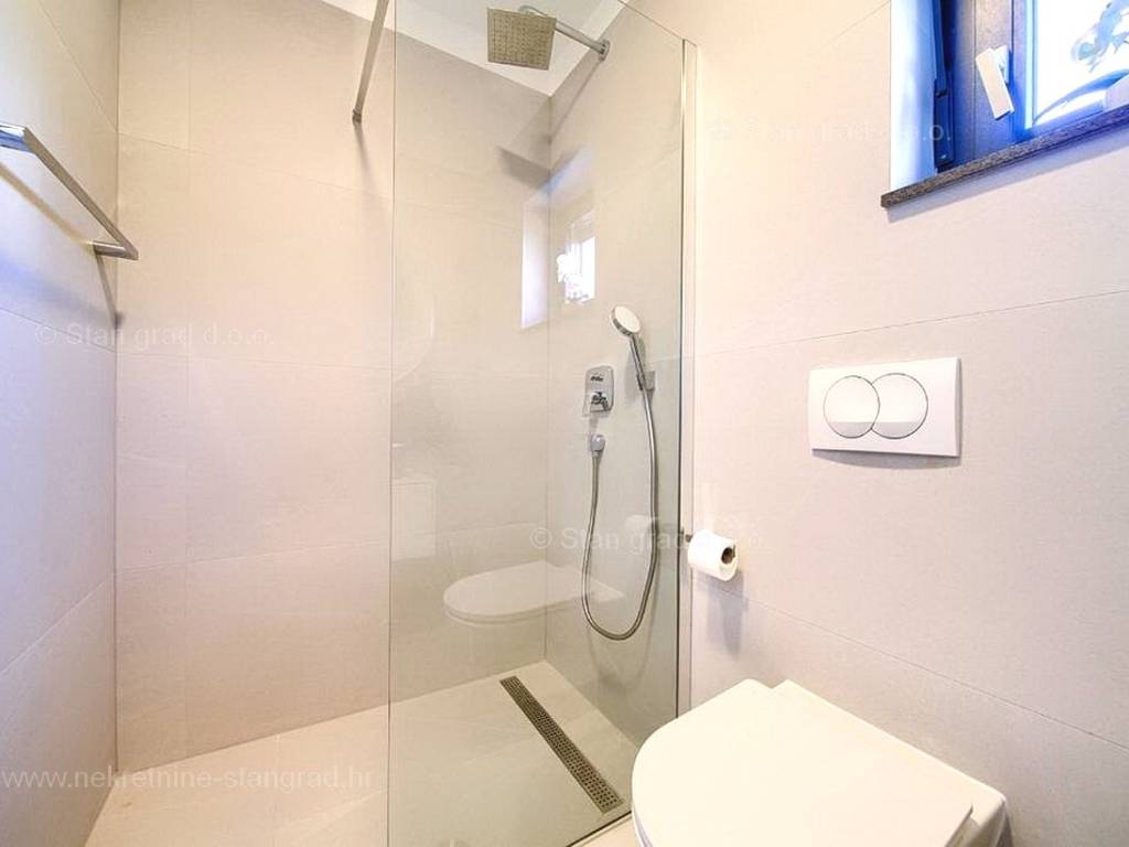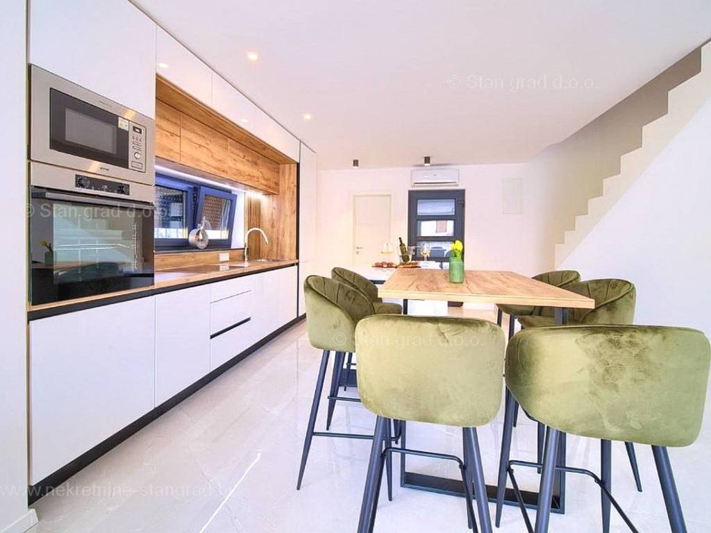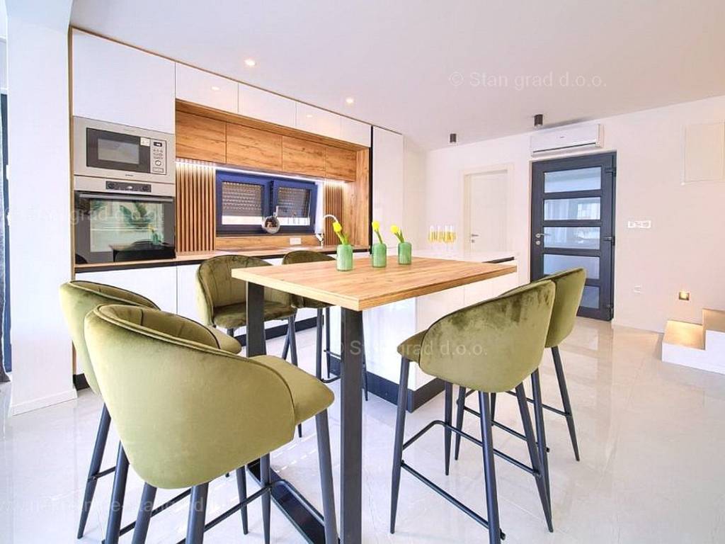 U agenciji Stan Grad Immobilien na prodaji je zanimljiv apartman za odmor unutar tradicionalno najtraženijeg hrvatskog primorskog jadranskog područja otok Krk. Navedeni se apartman nalazi na kvalitetnoj i urbaniziranoj poziciji nedaleko mora i središta mjesta Malinska. Po tipu nekretnine je ovo prostrani dvoetažni apartman s ulazom na nižoj etaži. U okviru vrlo lijepe građevine, apartman je pozicioniran u prizemlju i na 1. katu. Površina ovog apartmana iznosi ukupno 91 m2. Navedenom površinom su obuhvaćeni u prizemlju dnevni boravak i kuhinja, kupaonica i terasa, a na katu 3 spavaće sobe, 2 kupaonice i natkrivena terasa površine cca 8 m2. Unutarnji prostori nekretnine su osobito dobro održavani te u potpunosti opremljeni potrebnim tehničkim uređajima i vrlo kvalitetnim namještajem. Za istaknuti je da dodanu vrijednost apartmanu daje pripadajuća okućnica površine 124 m2 oplemenjena bazenom i sunčalištem. Vlasnik apartmana na raspolaganju će imati jedno parkirno mjesto. Uz ranije navedeno, apartman ima vrlo dobru orijentaciju te nudi lijep pogled na prirodni morski krajolik. Ovaj je apartman vlasništvo fizičke osobe pa je kupac prilikom prijepisa njegovog vlasništva na svoje ime u obvezi plaćanja poreza na promet u visini 3%. Prodavatelj jamči za urednost relevantne tehničke i vlasničke dokumentacije, kao i za mogućnost brzog i nesmetanog prijenosa vlasništva apartmana na kupca. Očekujemo vas na Kvarneru s uvjerenjem u vaše zadovoljstvo našom uslugom. Povrh stručnog prezentiranja naravnog i pravnog stanja nekretnine, ako se odlučite za kupovinu, agencija Stan Grad Immobilien rado će vam rado pomoći u prijenosu vlasništva nekretnine.