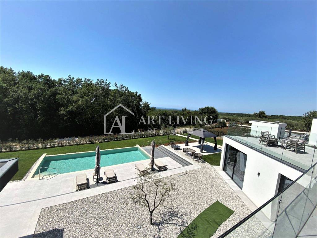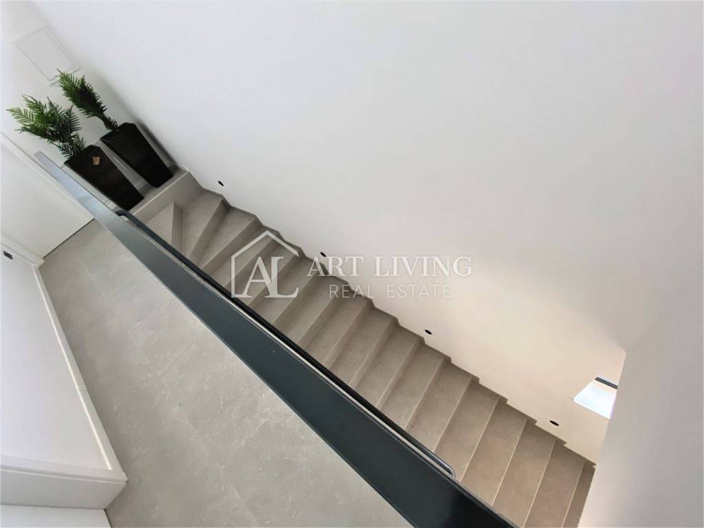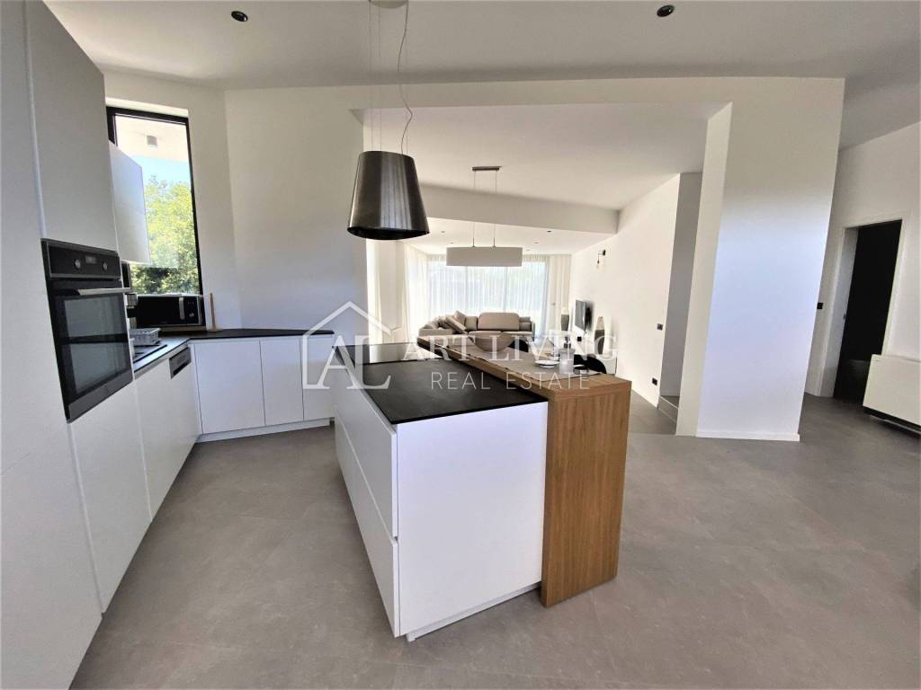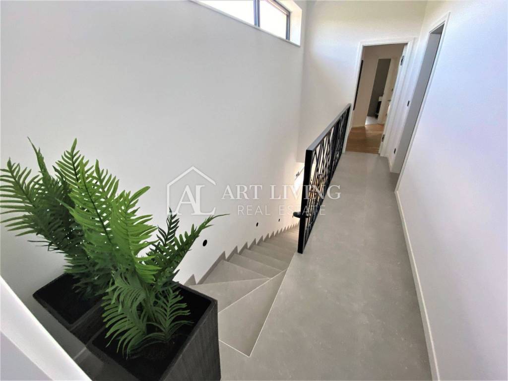 Ova prekrasna vila ukupne površine 300 m2 te okućnicom od 1.400 m2, sastoji se od dnevnog boravka s blagovaonicom i kuhinjom otvorenog tipa, četiri spavaće sobe s vlastitim kupaonicama, 2 WC-a, ostave, velike prostrane terase koja se prostire dužinom cijelog prvog kata s prekrasnim pogledom na more i Alpe koji ostavlja bez daha.