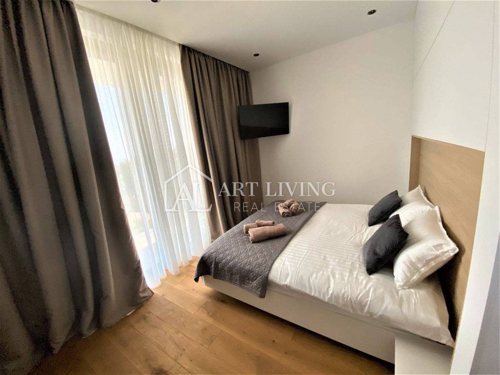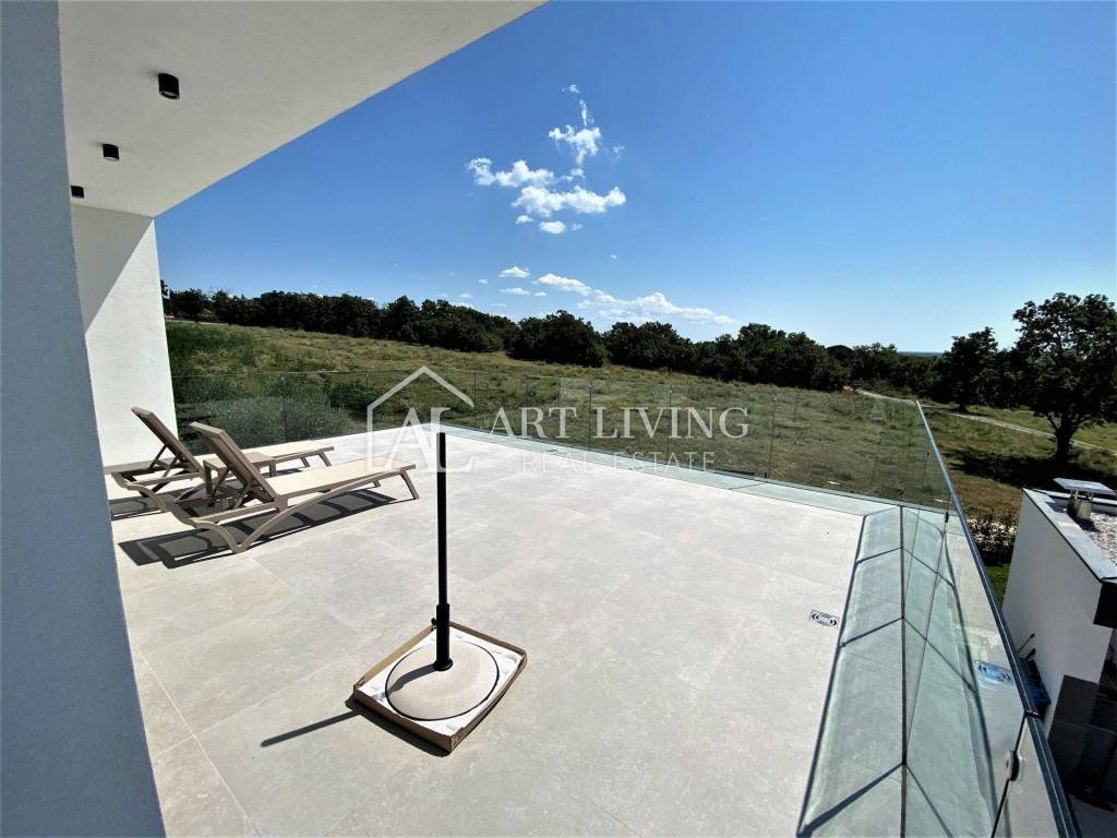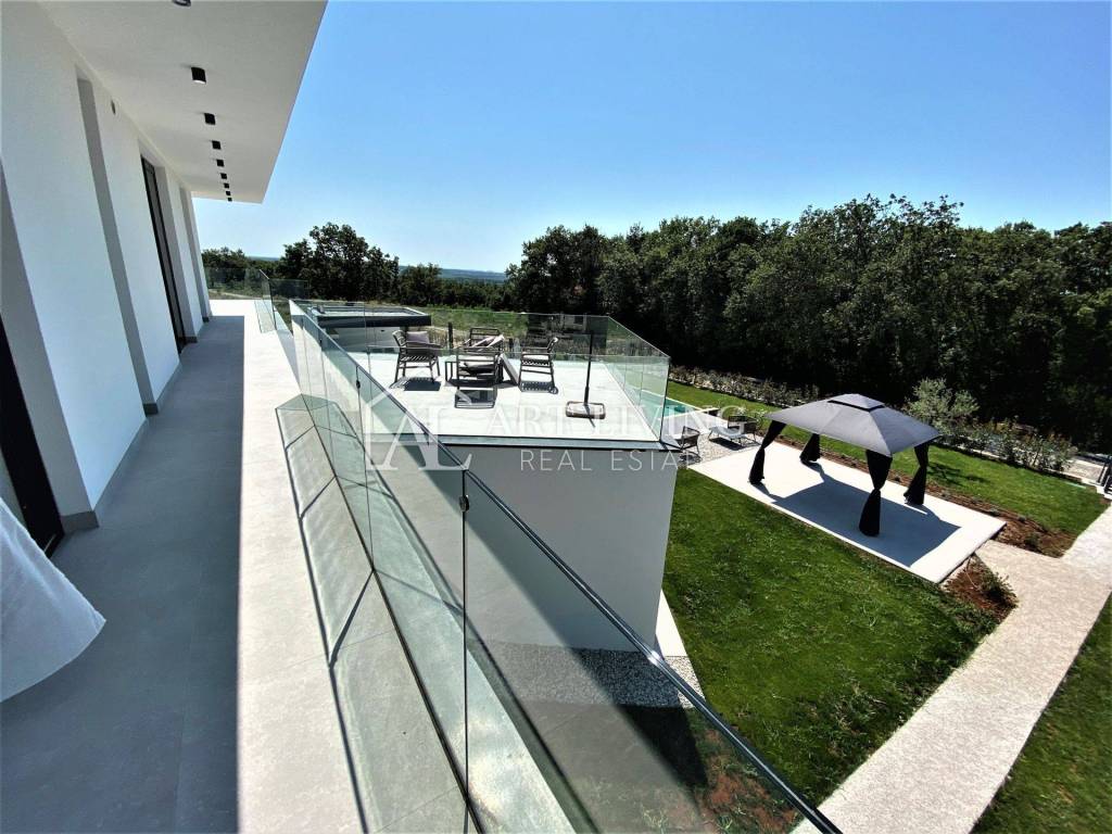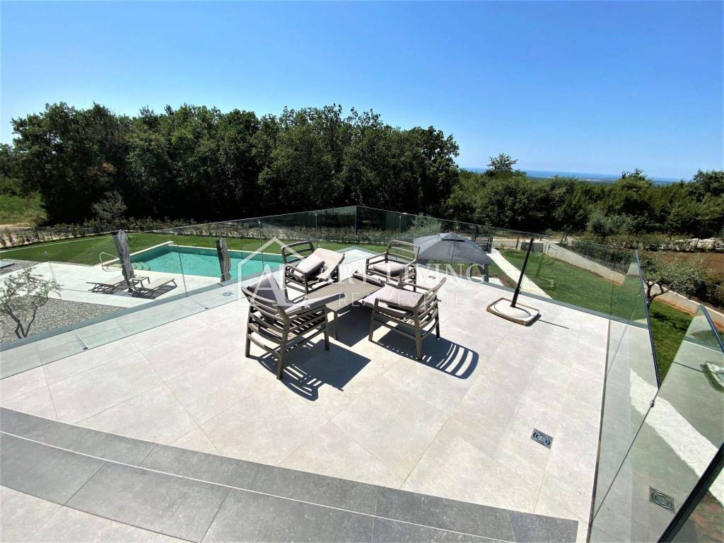 Ova prekrasna vila ukupne površine 300 m2 te okućnicom od 1.400 m2, sastoji se od dnevnog boravka s blagovaonicom i kuhinjom otvorenog tipa, četiri spavaće sobe s vlastitim kupaonicama, 2 WC-a, ostave, velike prostrane terase koja se prostire dužinom cijelog prvog kata s prekrasnim pogledom na more i Alpe koji ostavlja bez daha.