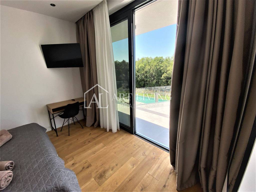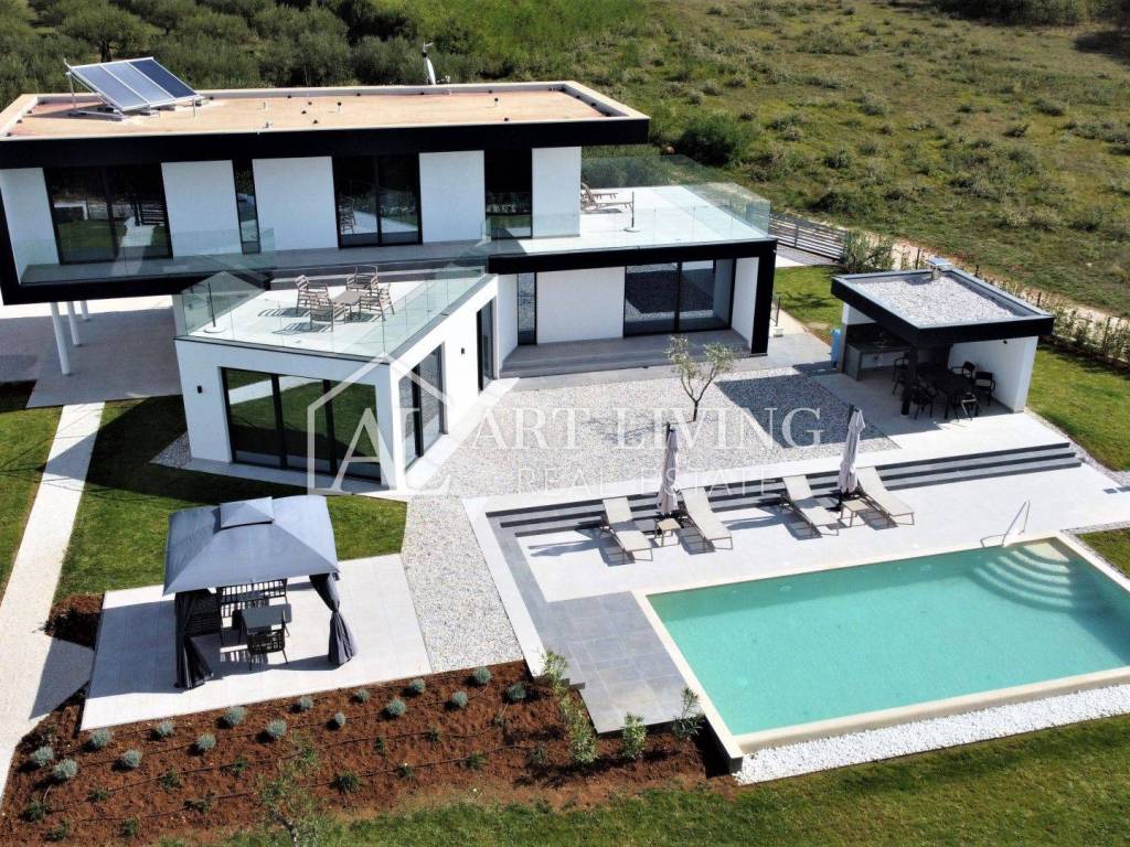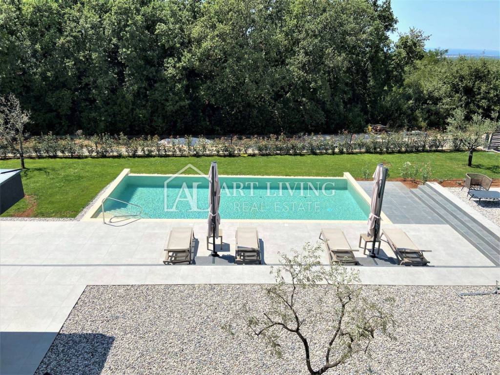 Iz dnevnog boravka pristupa se direktno bazenu površine 50 m2, lounge zoni te natkrivenoj otvorenoj ljetnoj kuhinji kompletno opremljenoj.