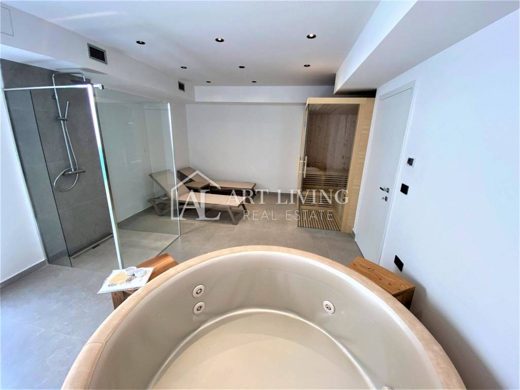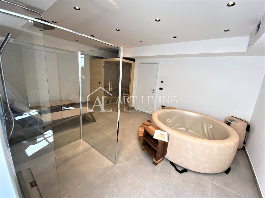 Također, u podrumu se nalazi wellness zona sa saunom, jacuzzijem s pripadajućom opremom te odvojena klimatizirana prostorija namijenjena za fitness.